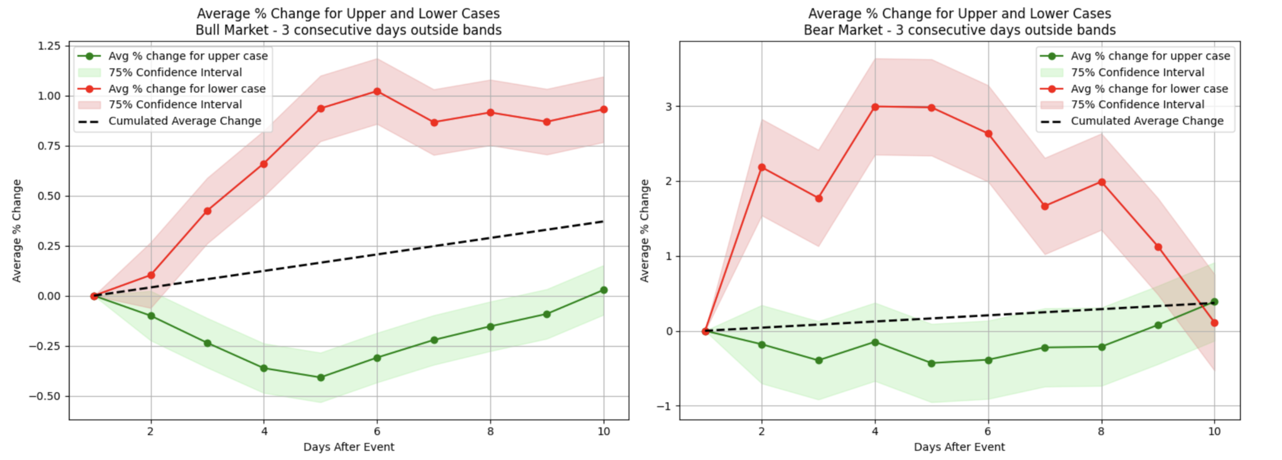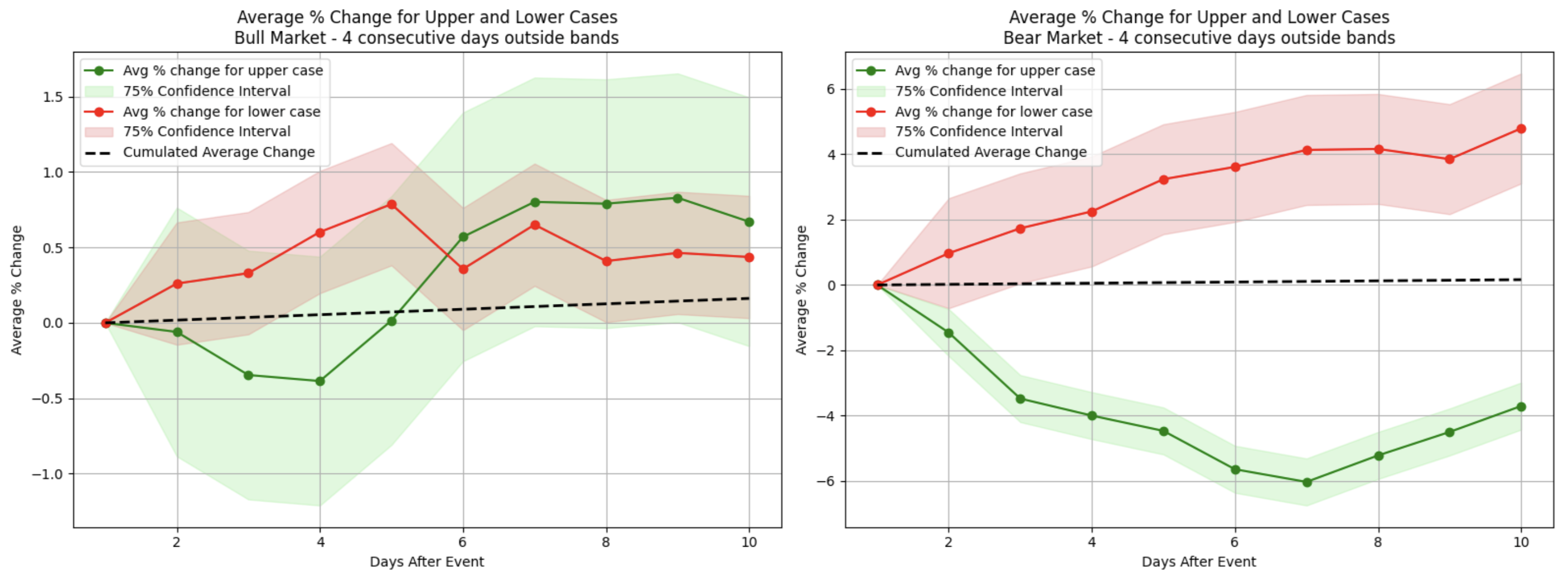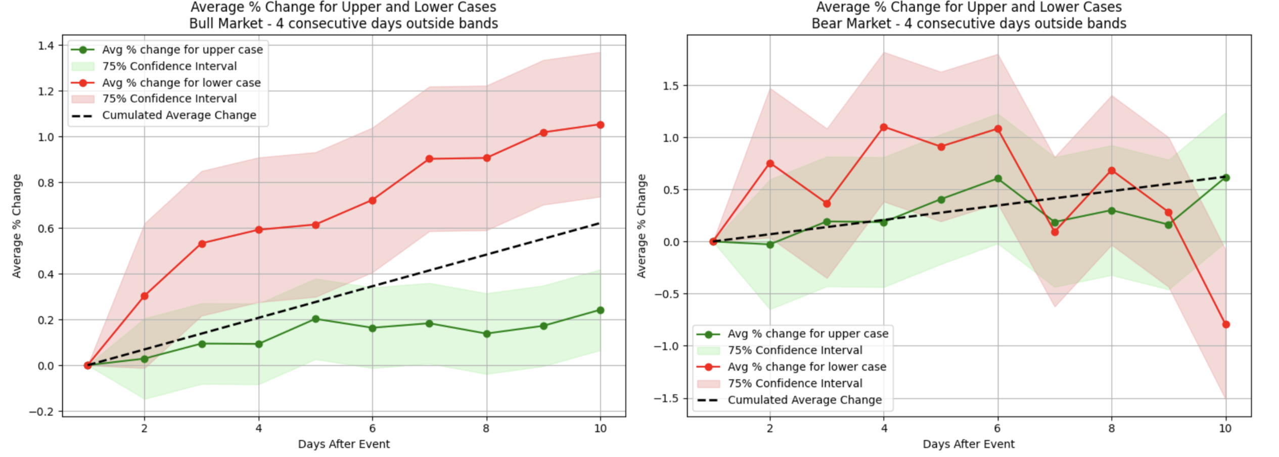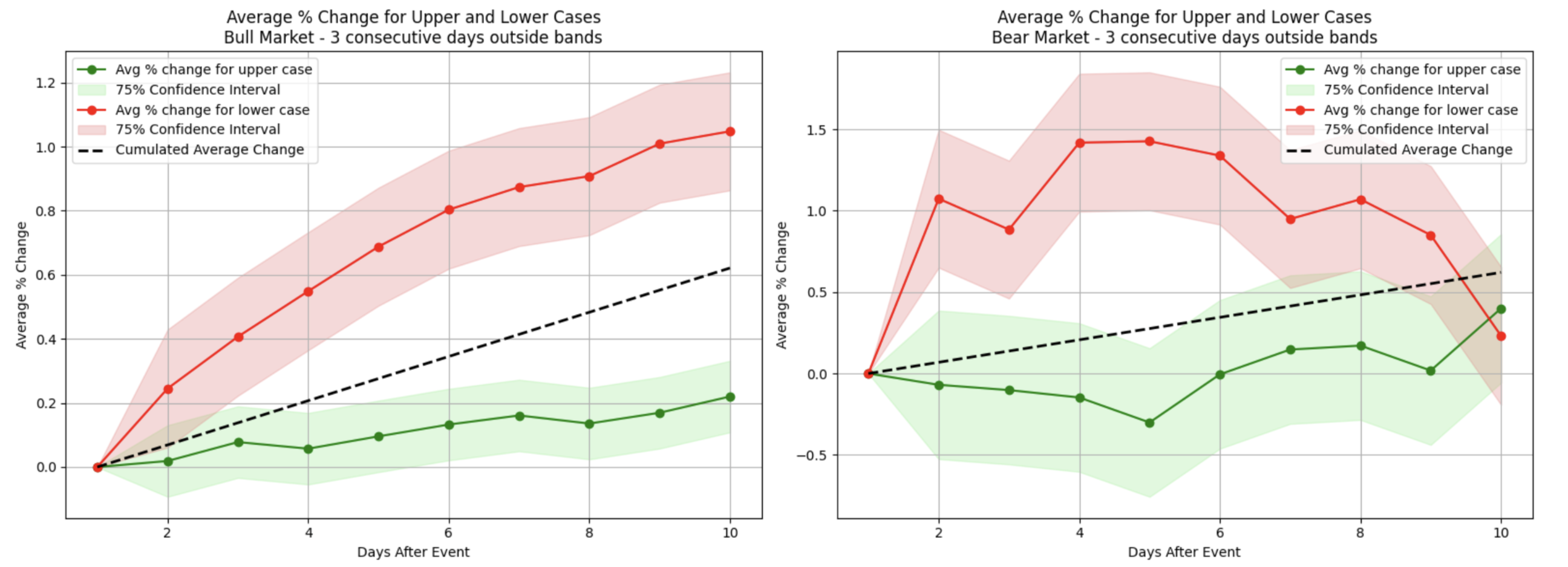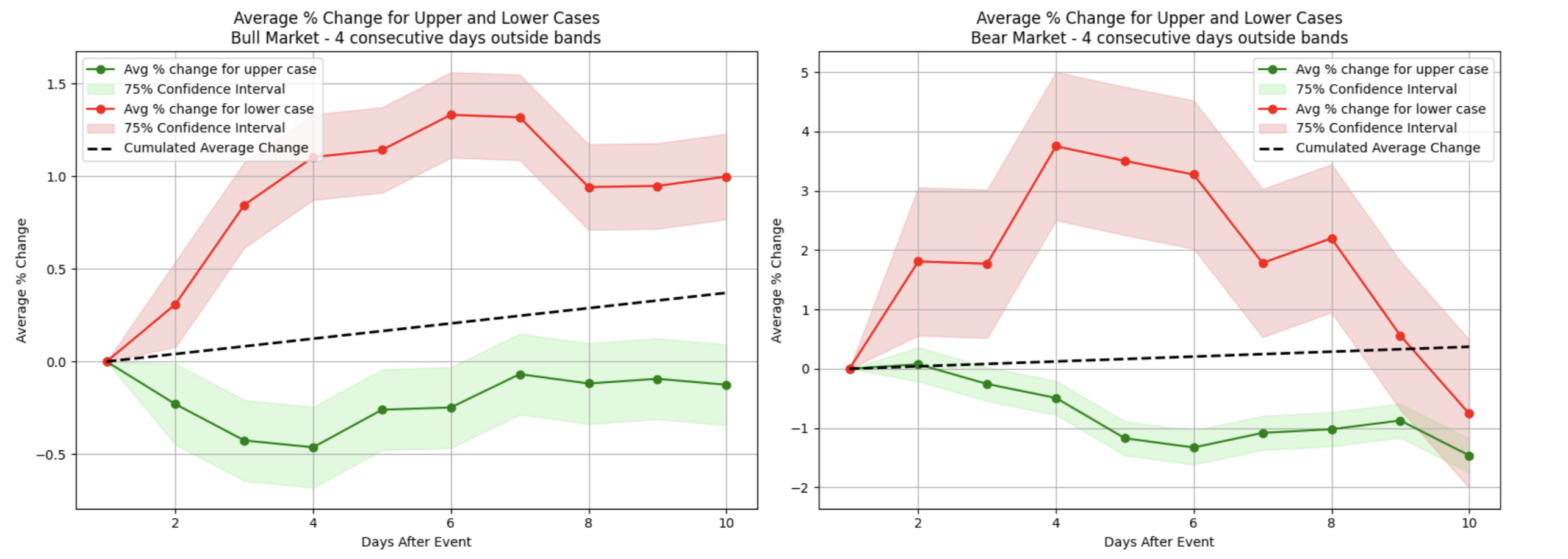 However, during bear market conditions, although a similar initial uptick occurred, these recoveries were generally weaker and often dissipated within two weeks (red plot on the right). Interestingly, when top stocks closed above the upper Bollinger band for two consecutive days (the green area), the bull market scenario showed a modest but noticeable price increase in the following two weeks, while bearish conditions displayed a similar pattern of behavior.