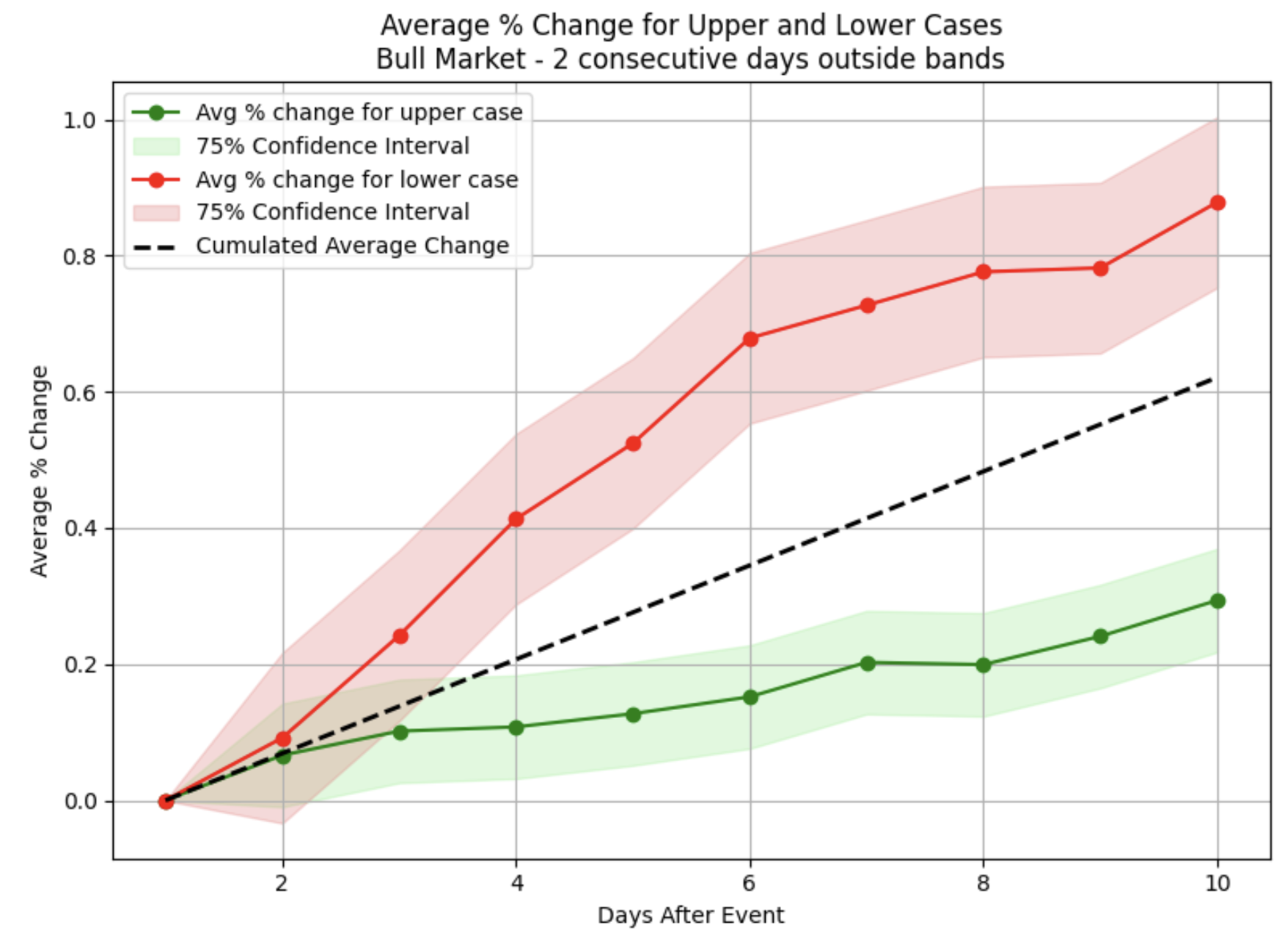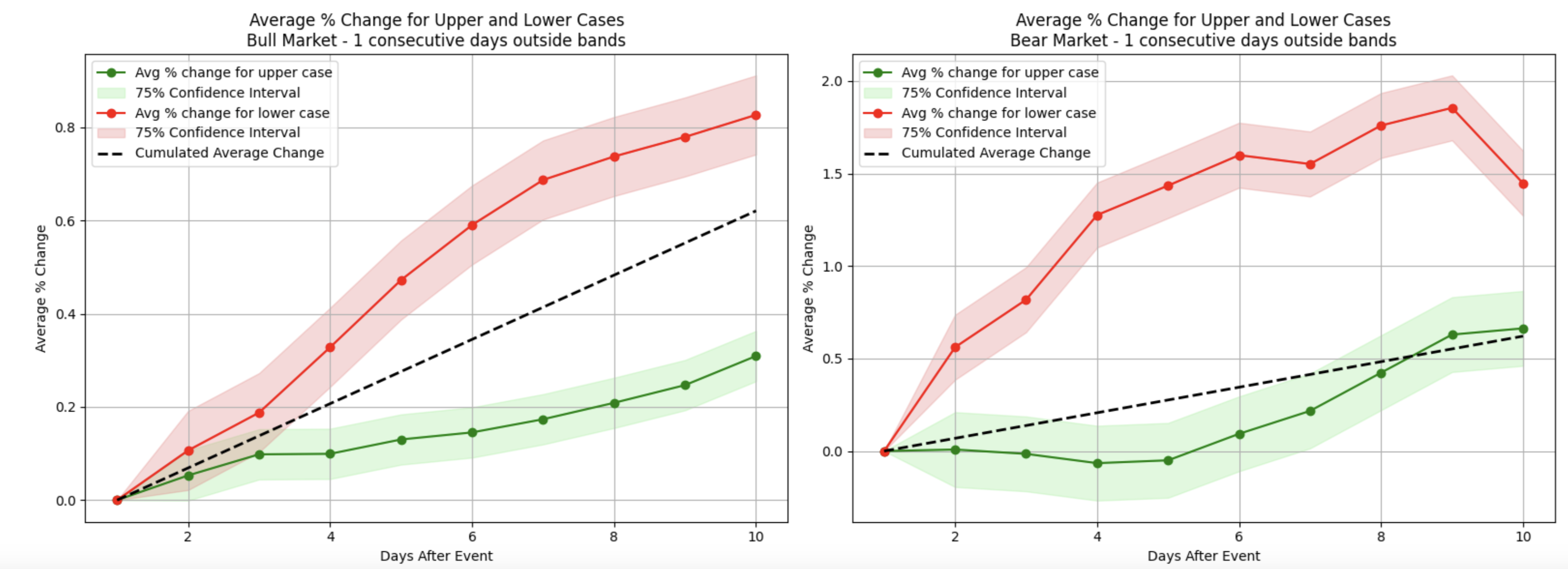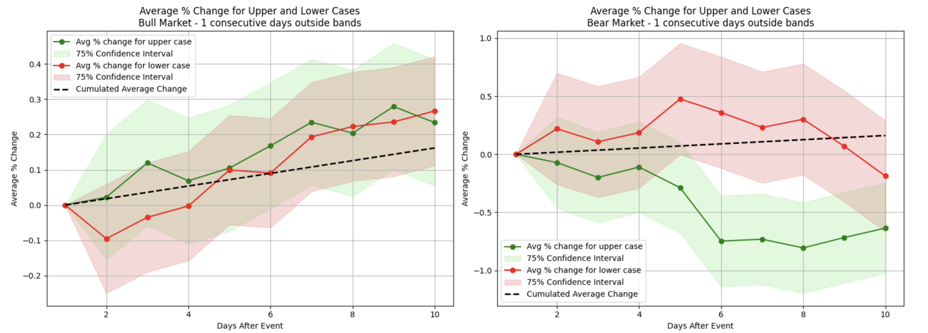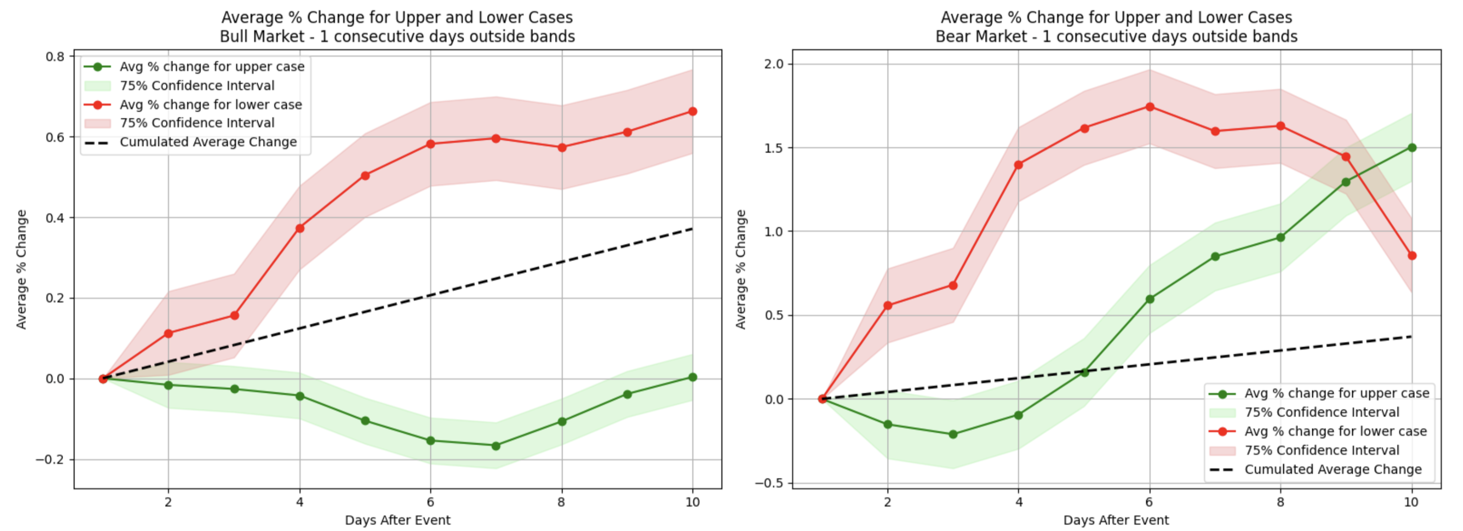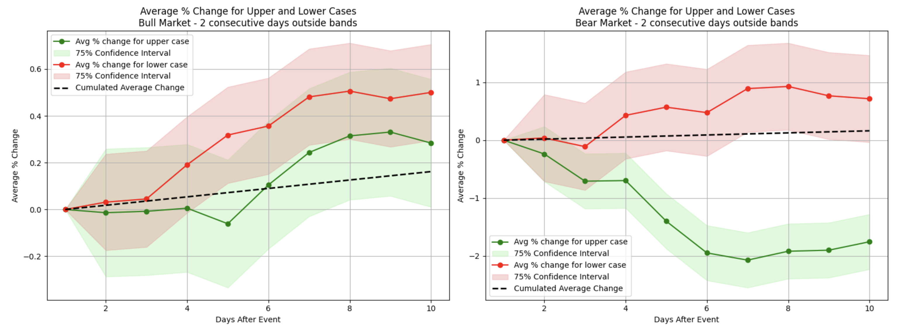 However, during bear market conditions, although a similar initial uptick occurred, these recoveries were generally weaker and often dissipated within two weeks (red plot on the right). Interestingly, when top stocks closed above the upper Bollinger band for two consecutive days (the green area), the bull market scenario showed a modest but noticeable price increase in the following two weeks, while bearish conditions displayed a similar pattern of behavior.