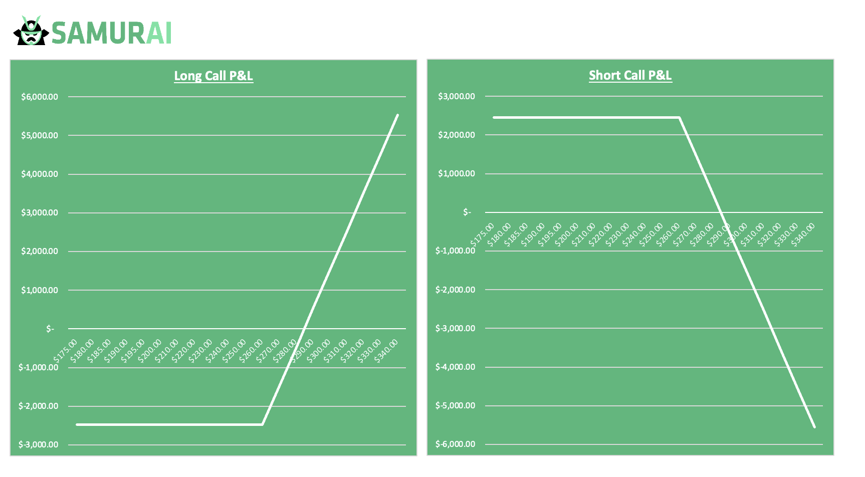 On the charts below, the X-axis is the underlying price at expiration, while the Y-axis is profit or loss.