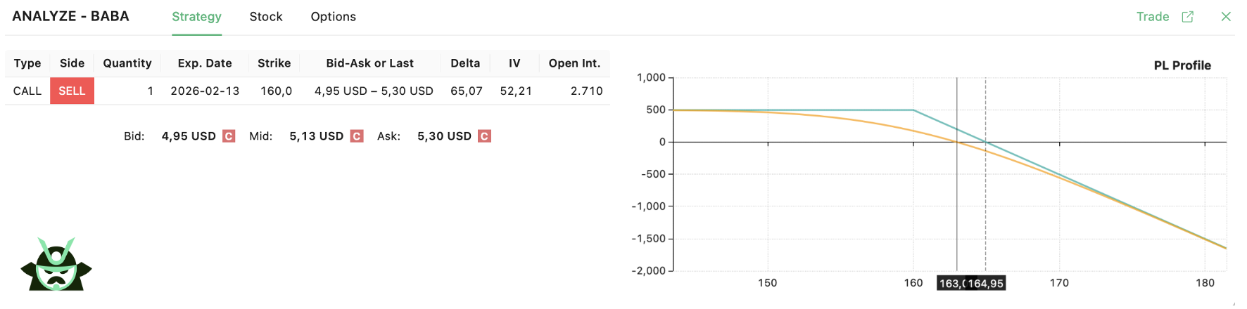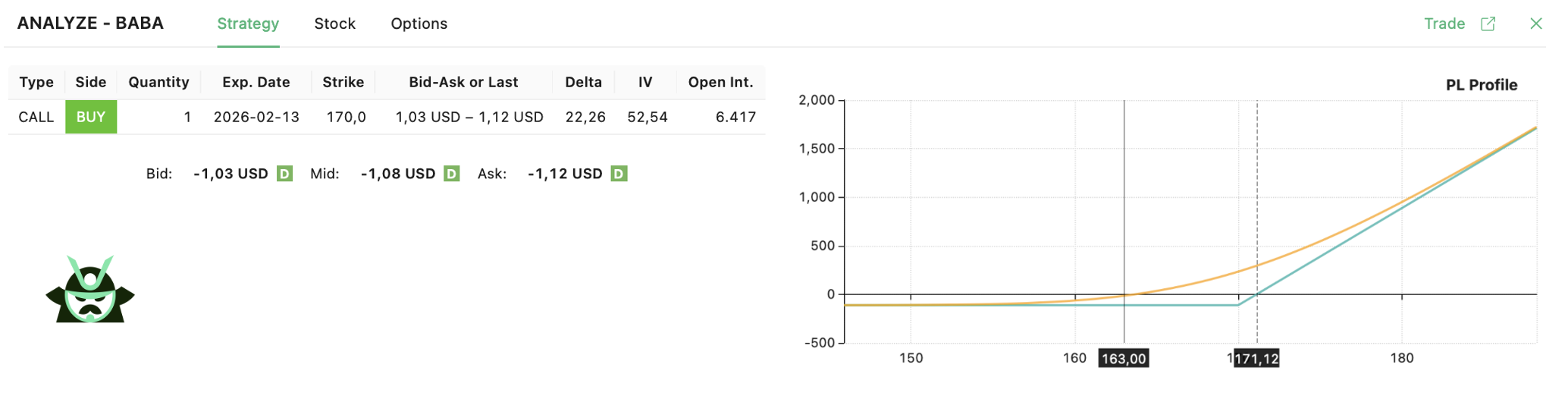 On a call option payoff diagram, the long and short sides mirror each other. Start with the long call (this is an example from BABA):