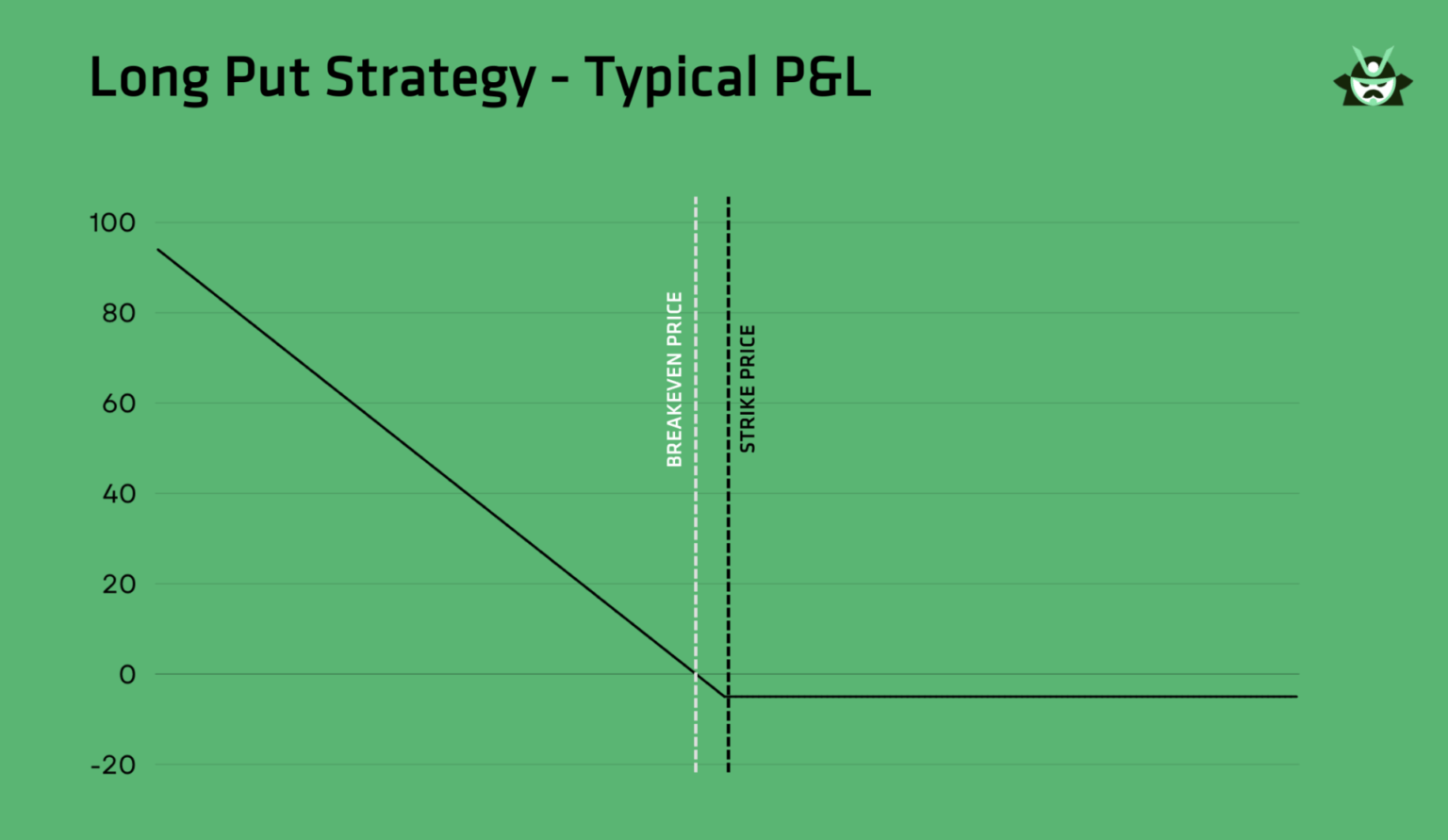 Notice the capped losses on the left, with the unlimited profit potential on the right. The specular situation will occur with a long put strategy: