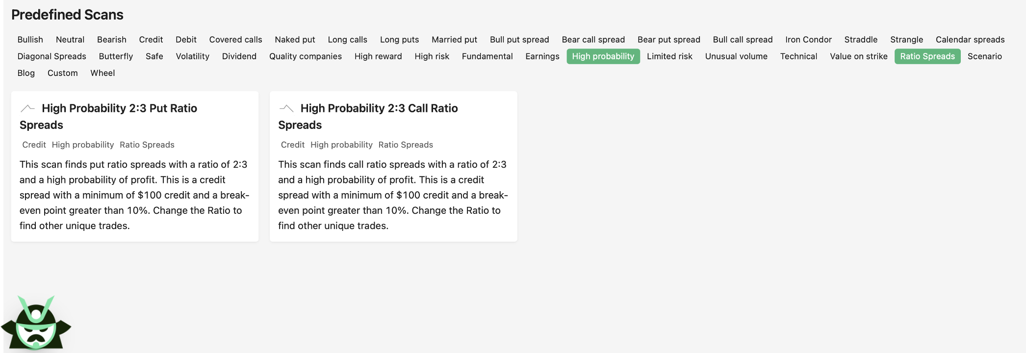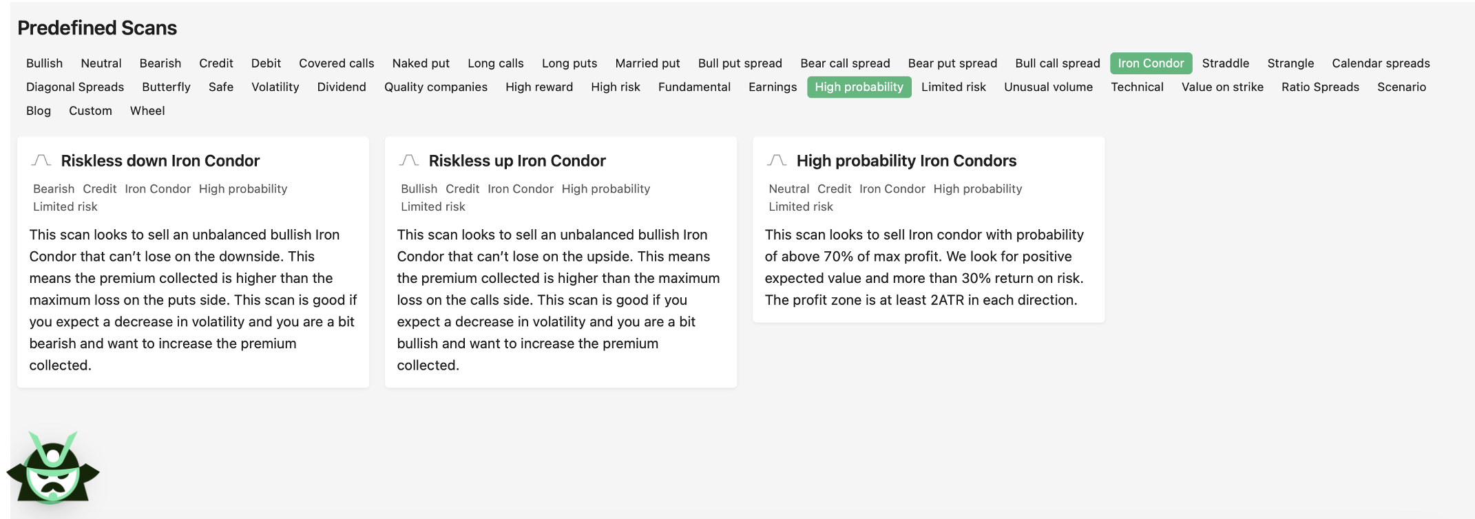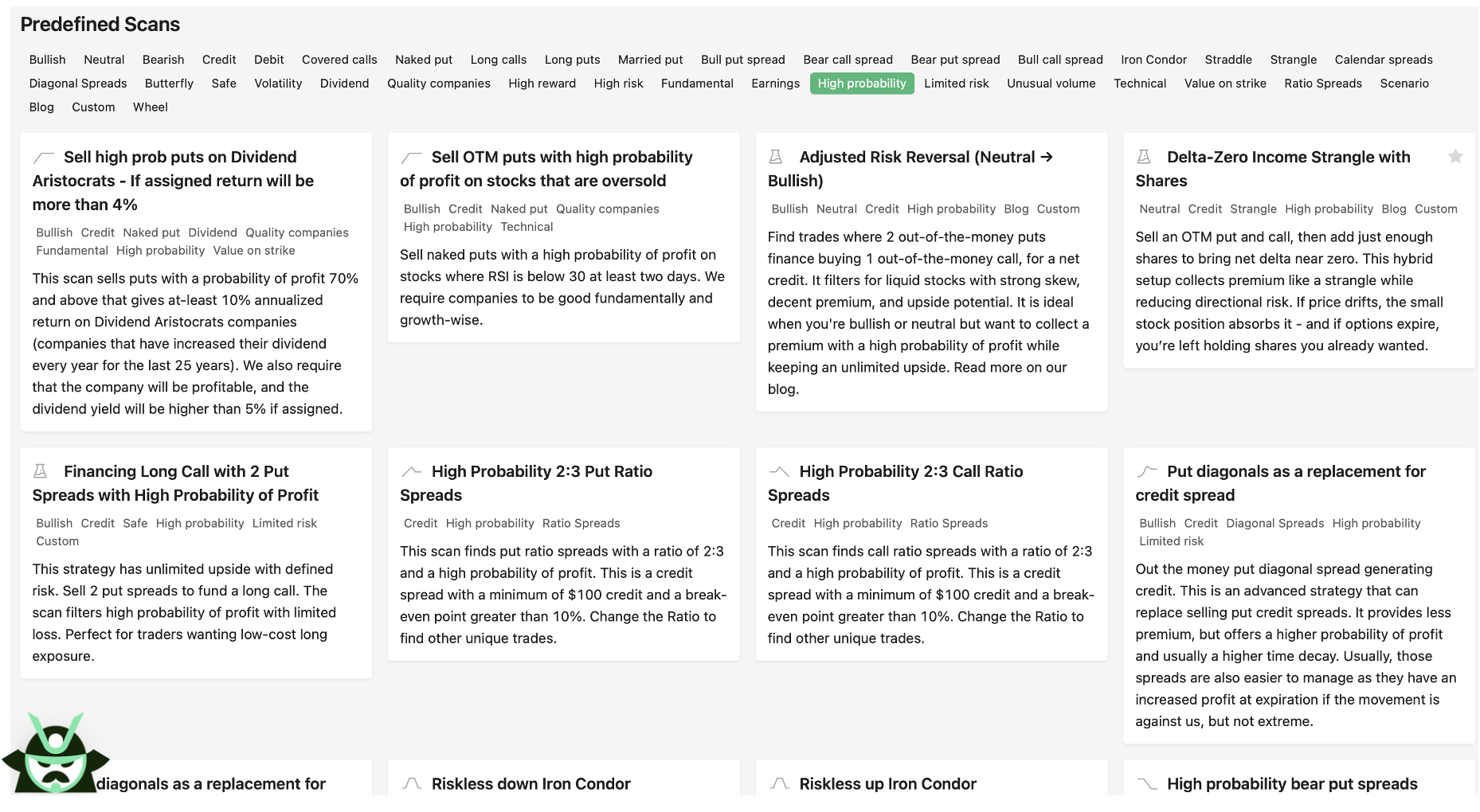 In general, if you’re looking for high probability options strategies, we have a “High probability” tag on our platform with several predefined scans for different types of traders:
