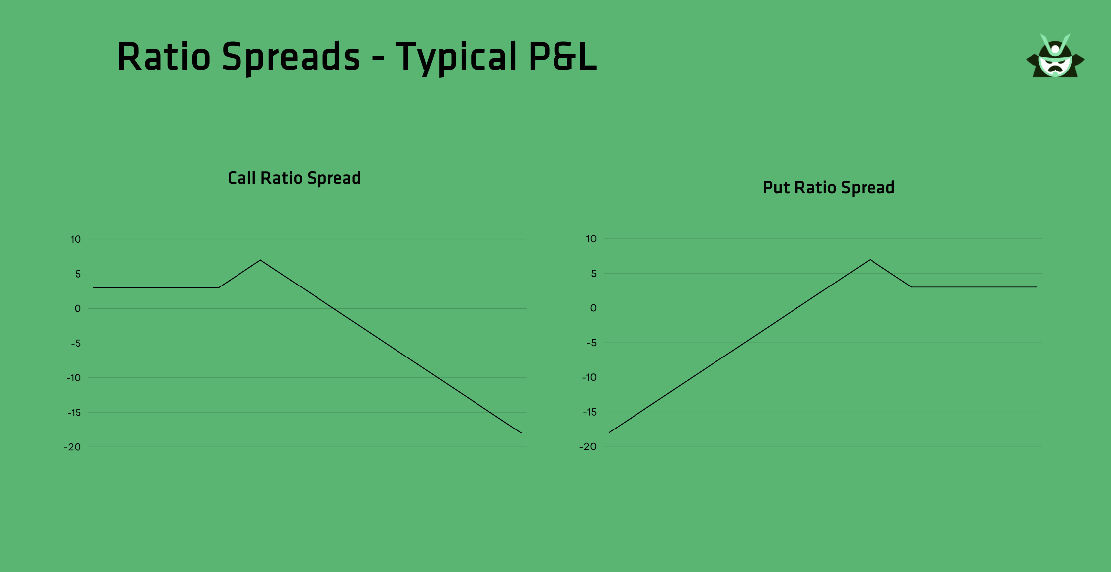 - No upward risk (put ratio spread) or downward risk (call ratio spread)