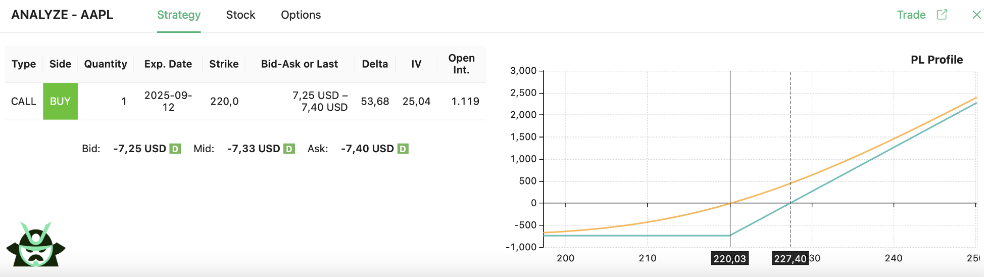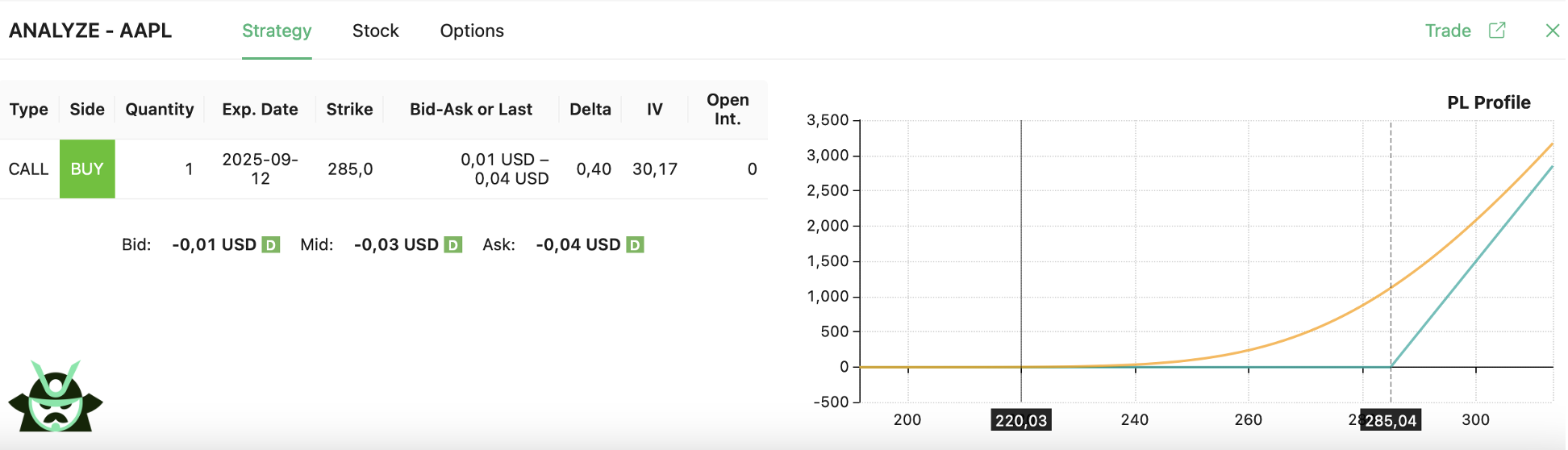 The benefit? Leverage. If AAPL moves fast, this option could multiply in value. But you need that move to happen fast, and you’re likely to lose 100% if it doesn’t. This is a classic setup for aggressive traders betting on a sharp breakout. In fact, you may be lucky to spot a quick upside move in 1-2 weeks, realize you have a nice % profit, and close the position.
