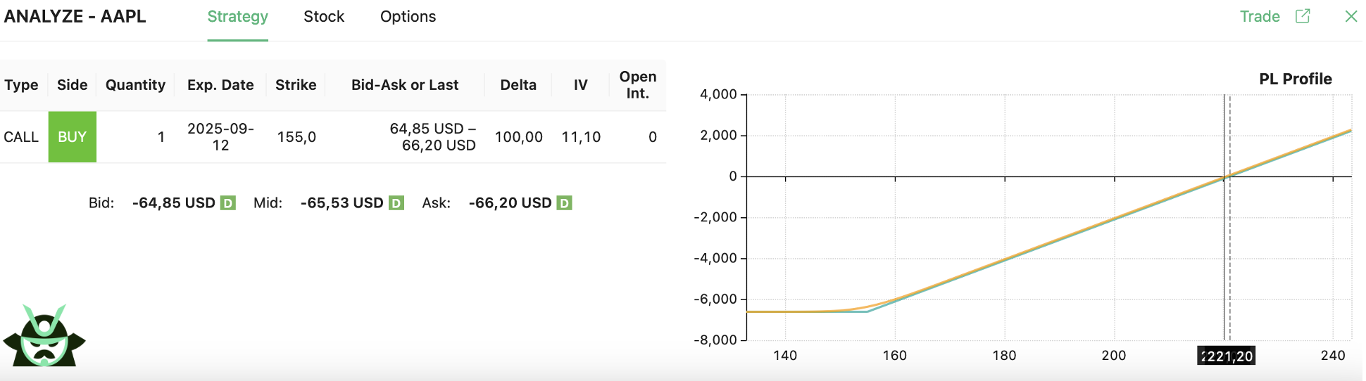 Now let’s move to a deep in-the-money option. The 155 call expiring September 12 trades for around $65. The P&L looks like this: