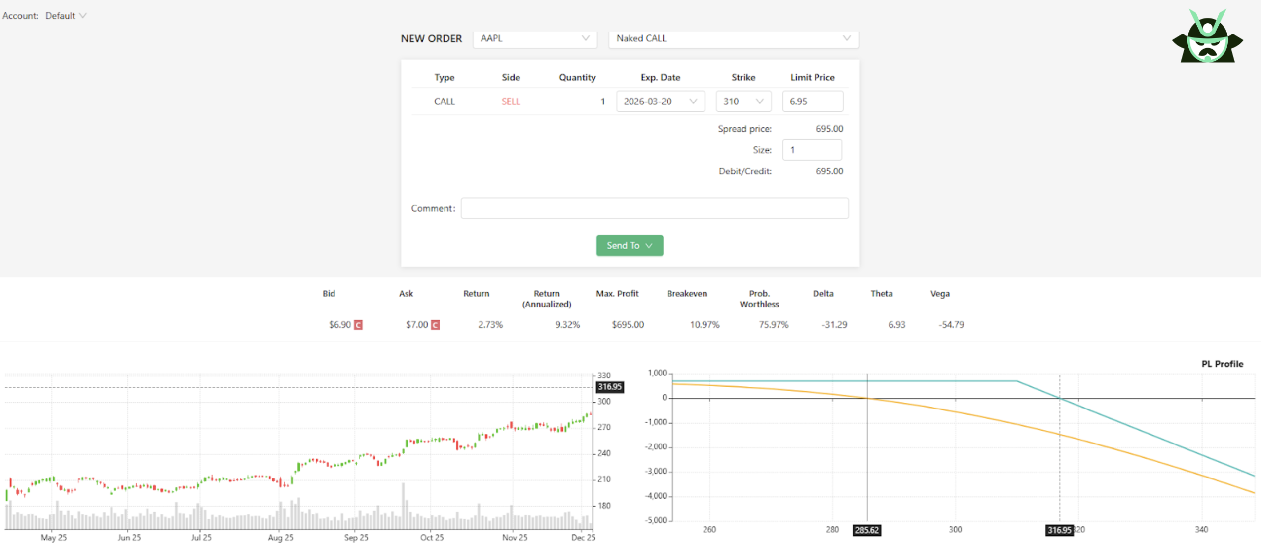 Let’s analyze a “naked call” trade shorting the $310 strike call. Since the strike ($310) is significantly higher than the stock price ($285.00), this is an out of the money option.