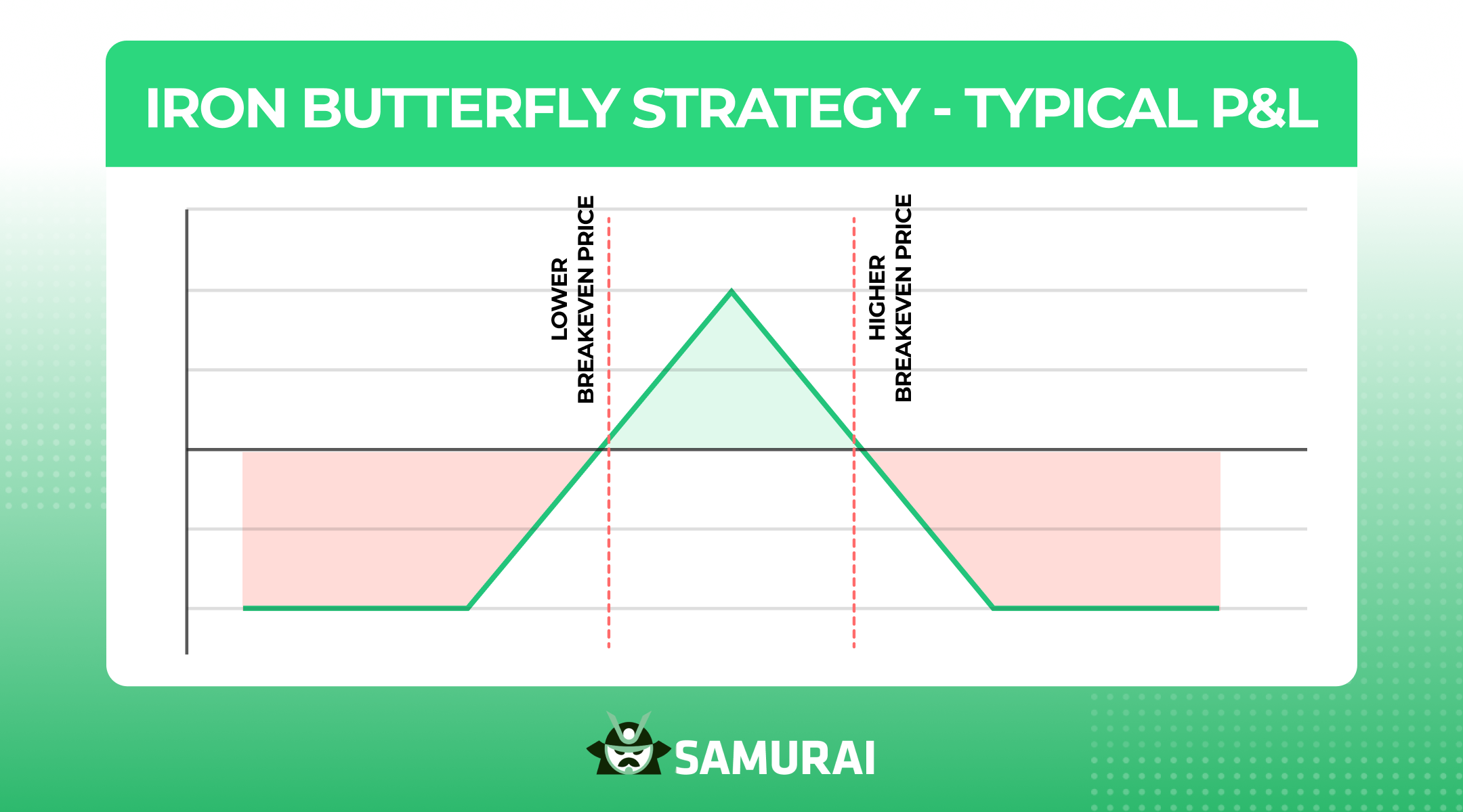 - The iron butterfly has a triangular profit zone, peaking at the short strike but narrowing quickly as price moves away