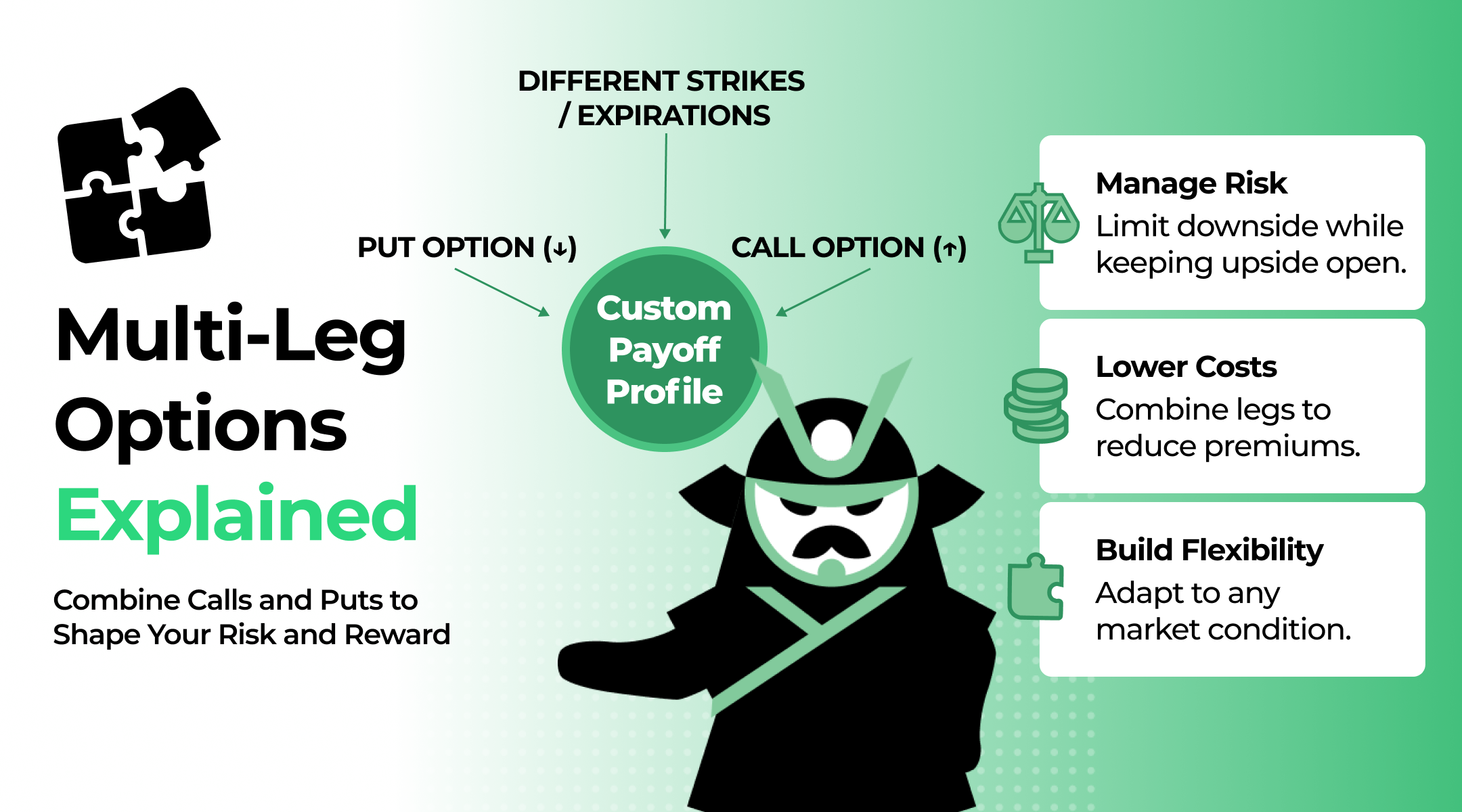 Multi leg options are setups consisting of two or more option legs combined into one position to create specific payoff profiles.
