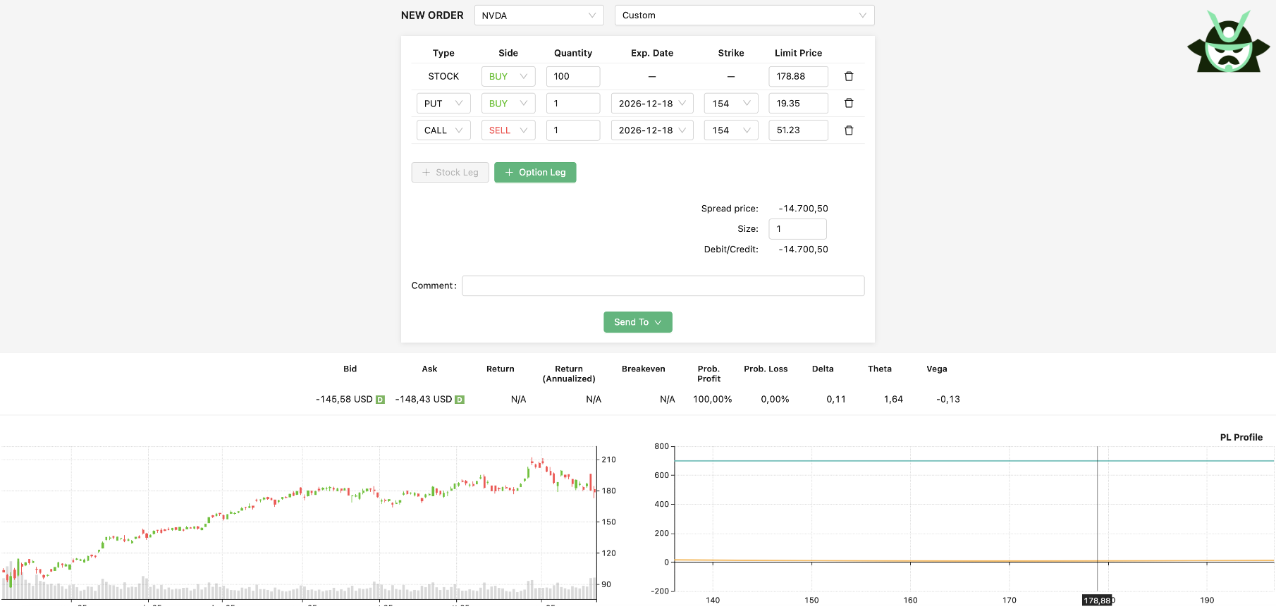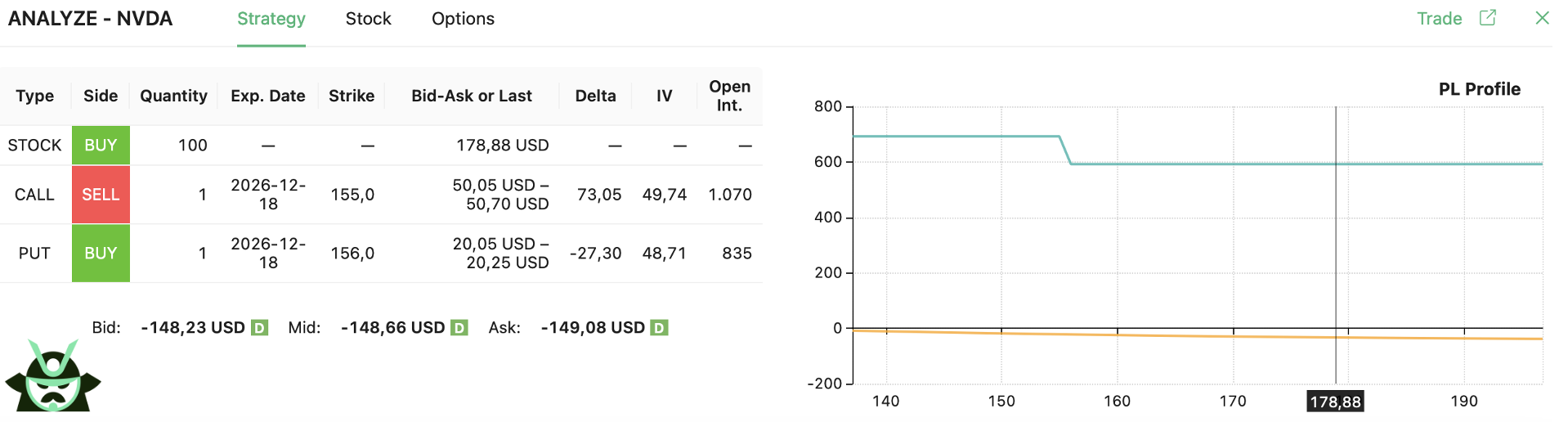 Let’s look at a practical example on NVDA with the help of our options strategy screener. This will allow us to show how a no loss option strategy can appear when the standard call and its synthetic version drift apart. Take options expiring one year from now. With NVDA trading at 178.88, look at the $154 strike.