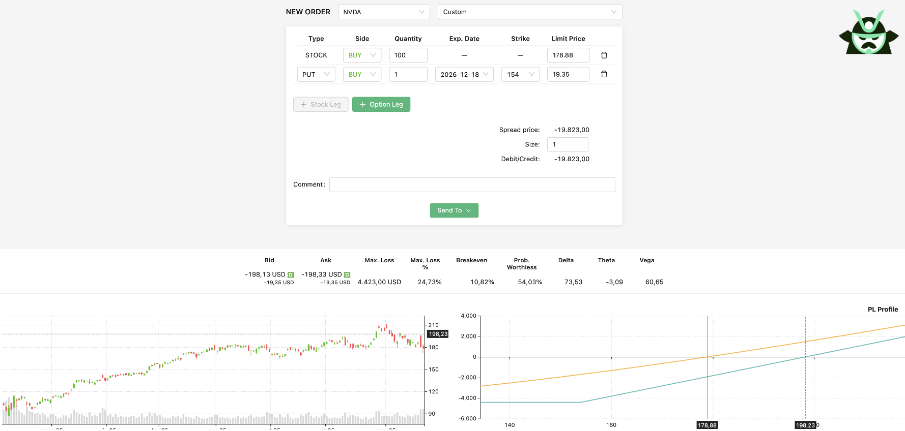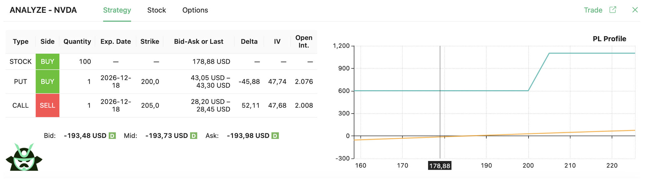 Take, again, NVDA options expiring a year from now. Start with a bullish case: long 100 shares, long the $200 put, and short the $205 call.
