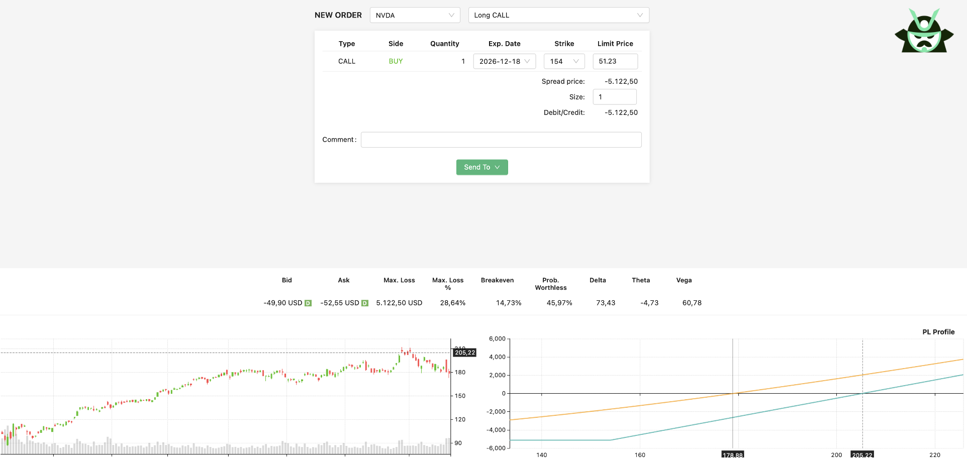The middle area between 185 and 235 is where things can get interesting. The payoff rises and peaks at 210 with a max profit of 2,997. Is hitting that exact number realistic? Probably not. But trading does not need perfection. As time passes, the orange curve in your chart will usually lift. If at any point you see an open gain above the 500 level, you can simply close the trade and call it a day.