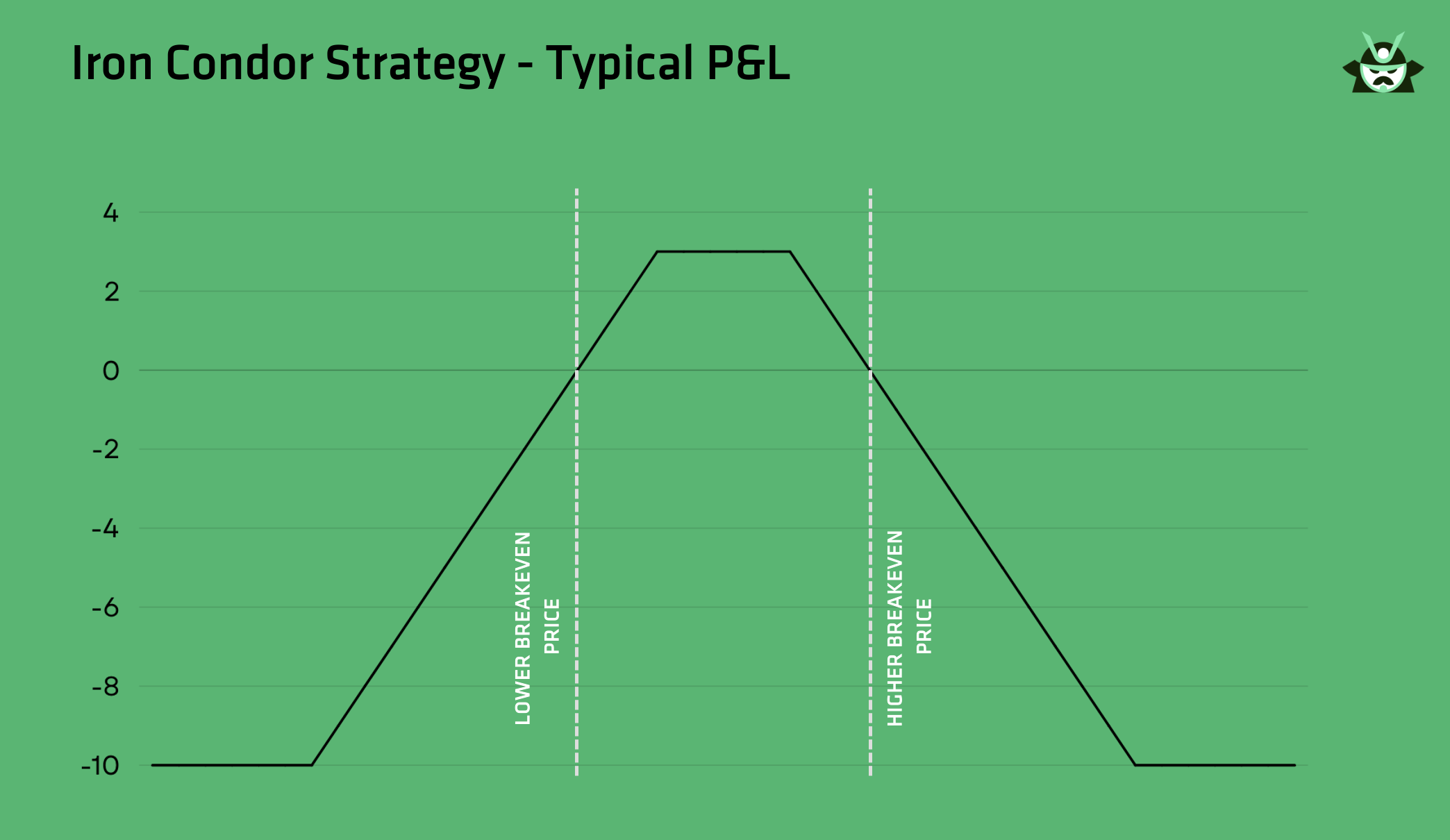 The “wings” of the iron condor (the long call above and the long put below) define your maximum loss, which makes this options strategy for a sideways market attractive for traders who want a clear risk boundary.