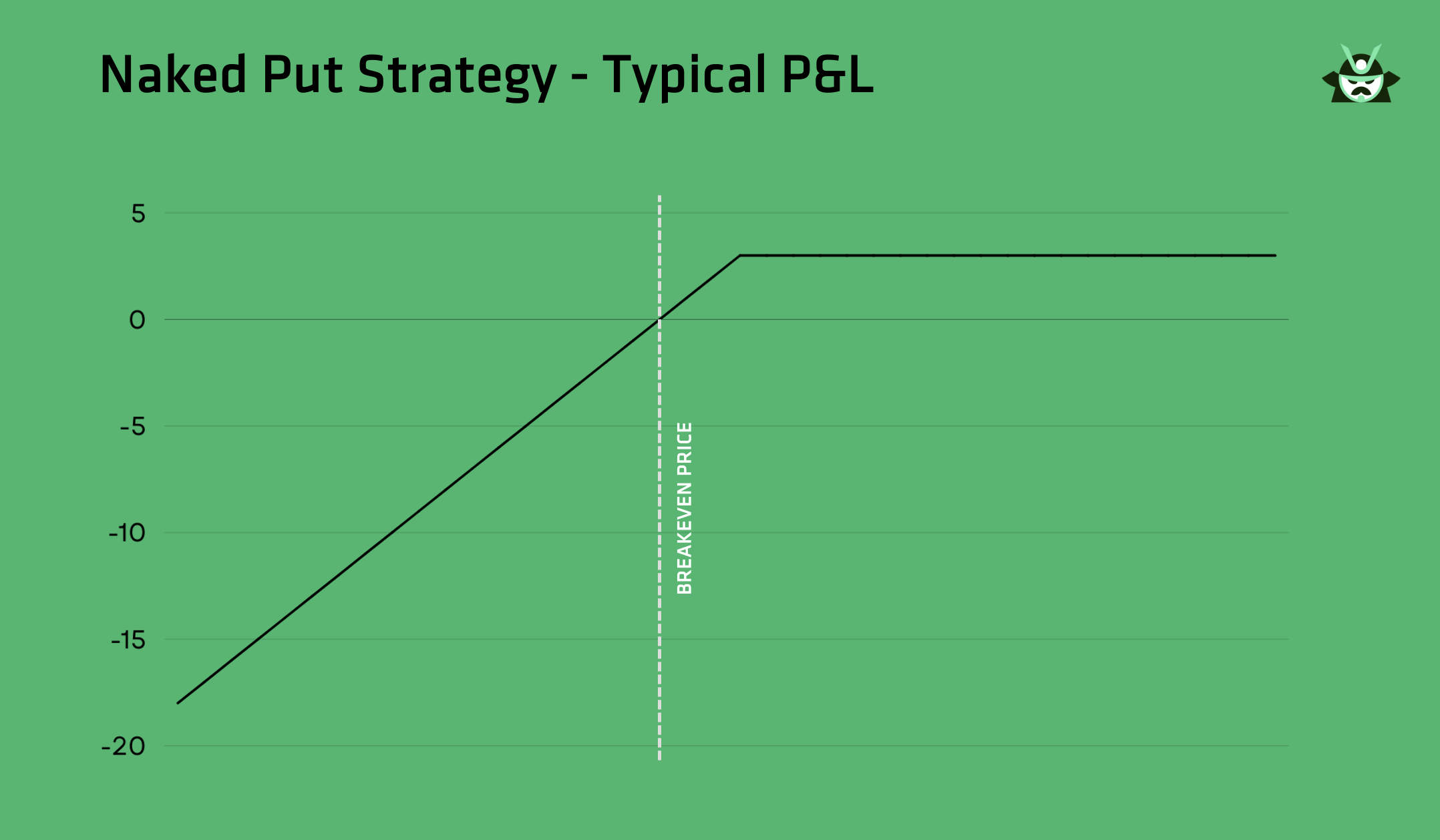 Selling out-of-the-money options can be a simple options strategy for a sideways market (or, better, sideways to mildly bullish). You profit as long as the option stays OTM until expiration, which means the underlying never reaches your strike. In general, we prefer selling puts because they tend to expire worthless more often than calls (as we told you in the past when talking about the most successful options strategies on the market). So, in the naked put case, you’d have the following P&L chart: