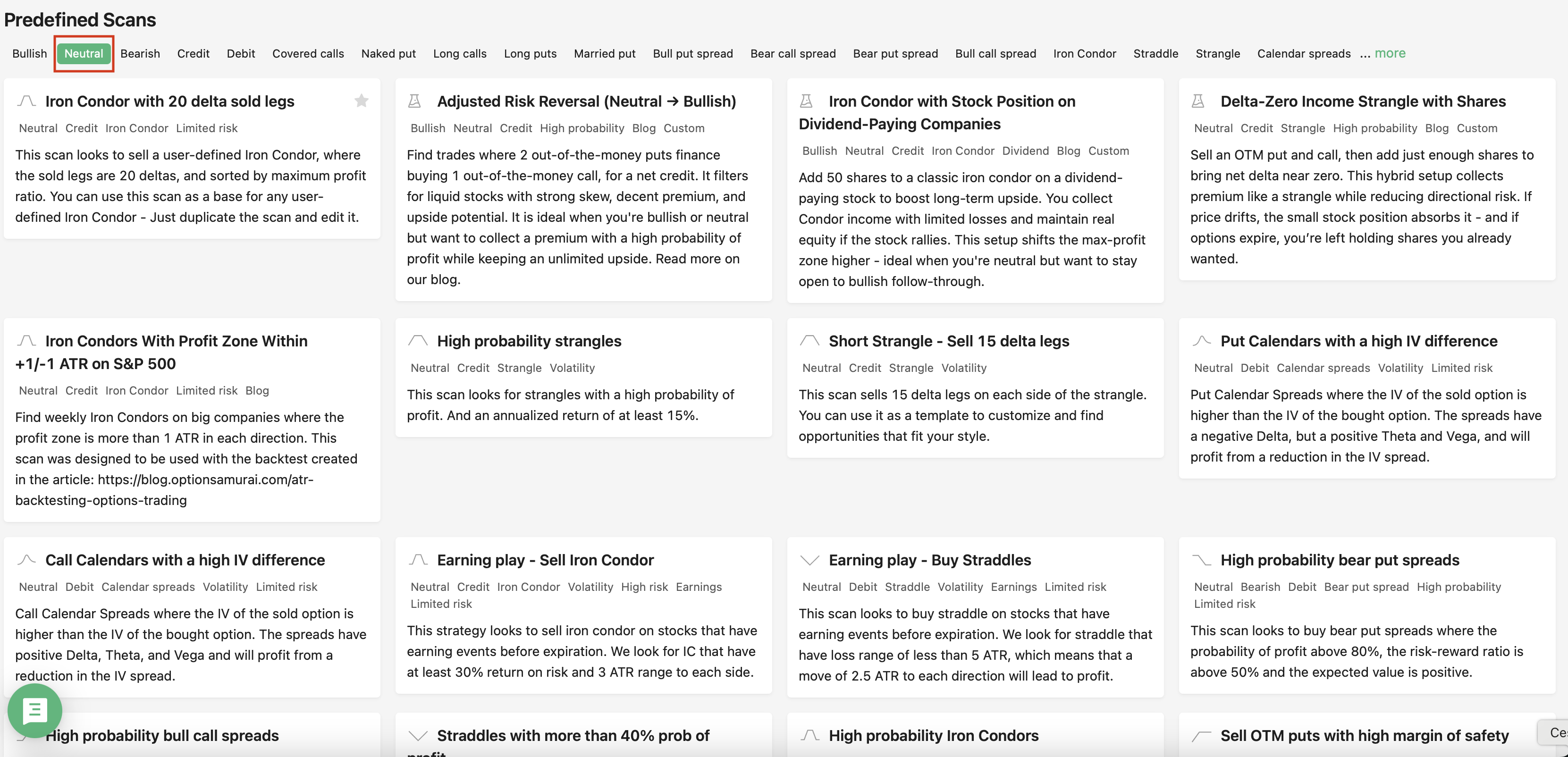 On Option Samurai, you can use the “Neutral” filter to find top sideways-market trades based on probability and reward-risk metrics.