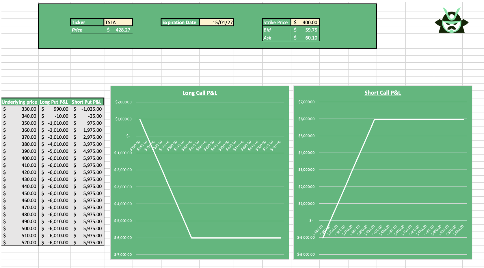 Take our Excel template and set the ticker to TSLA, the expiration date to January next year, and select a $400 put. With just these inputs, the template builds the full picture at expiration: