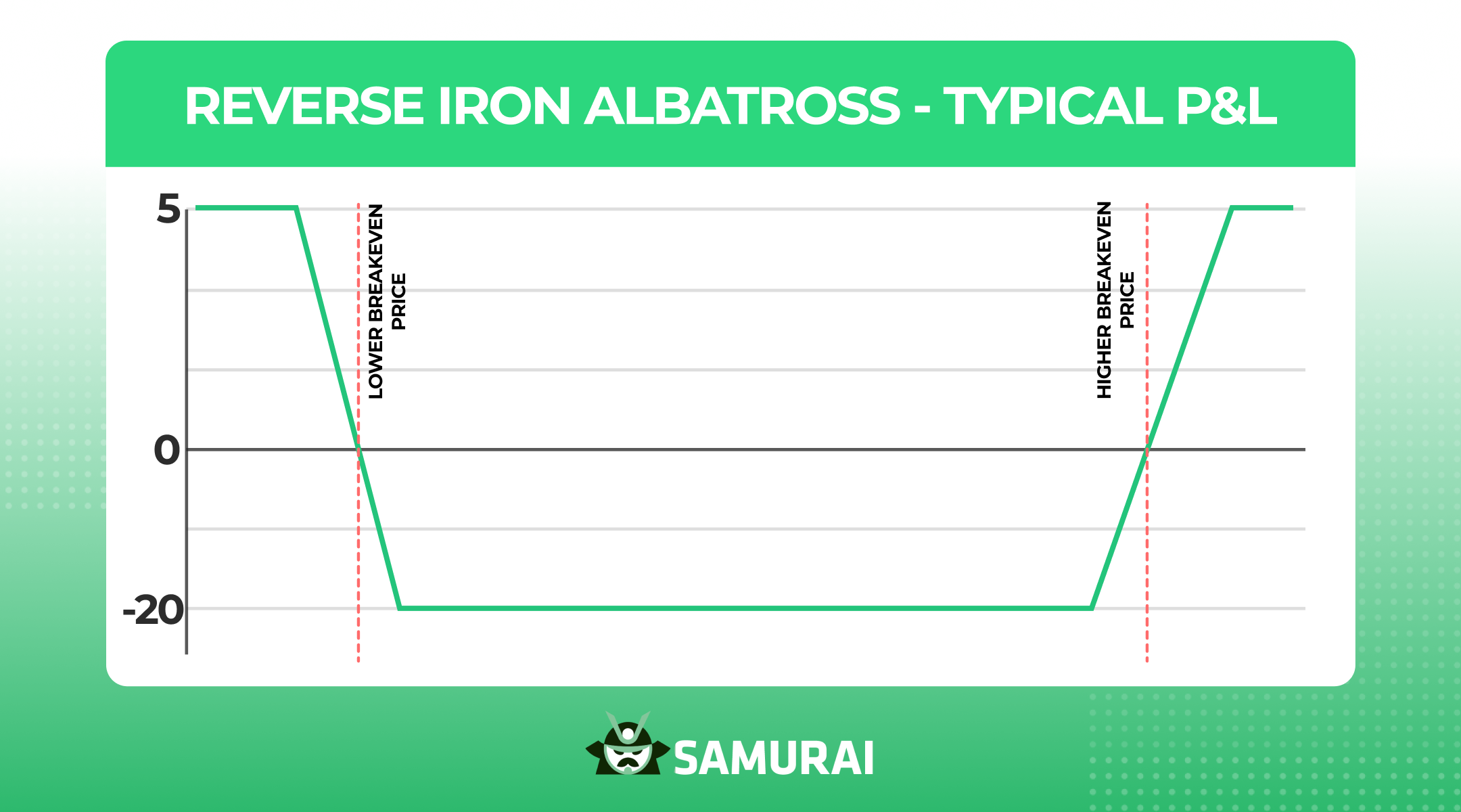 The reverse iron albatross spread is a four-leg options strategy that profits from strong price movement.Â