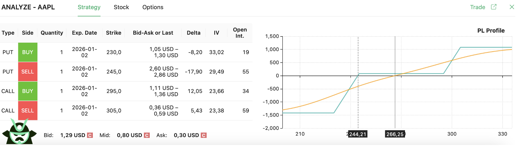 You can also turn a risk reversal option into a four leg structure. For instance, buy a 230 put, sell a 245 put, buy a 295 call, and sell a 305 call: