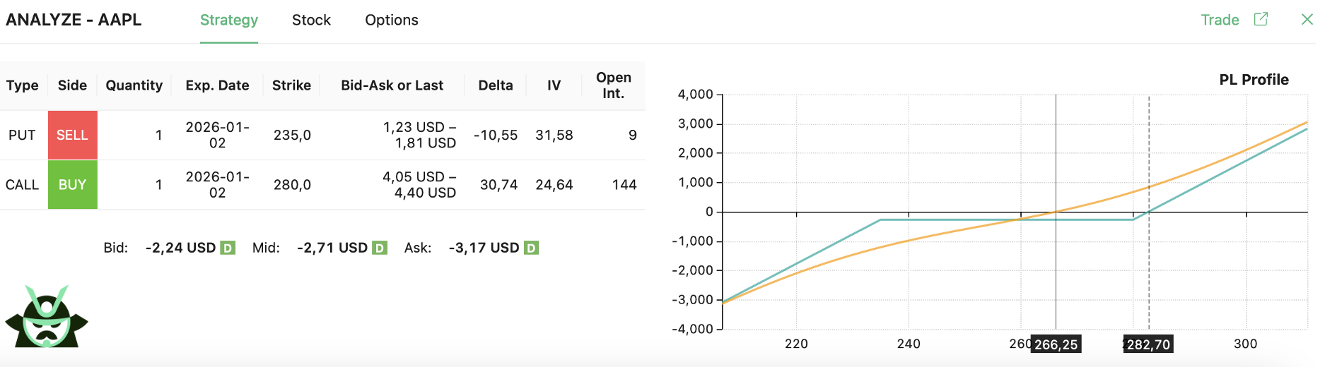 This version starts as a debit. You can see it right away on the P&L chart because the flat section sits below zero, at -270.50 dollars. The structure gives you unlimited upside if AAPL rallies, since the long call has no cap. On the downside, losses are also uncapped once price falls through the short put strike.