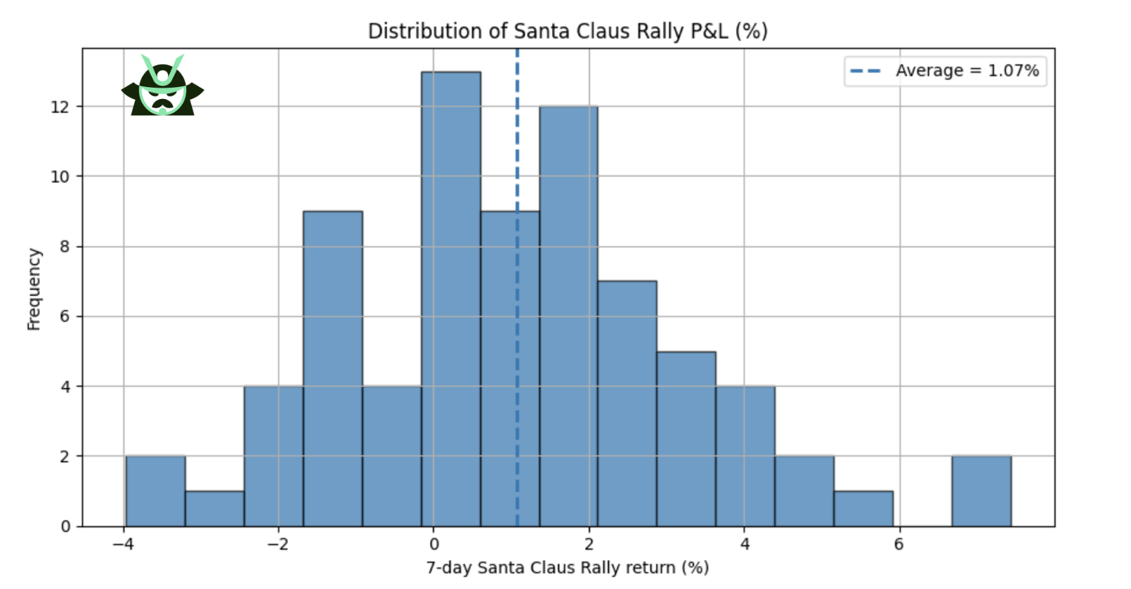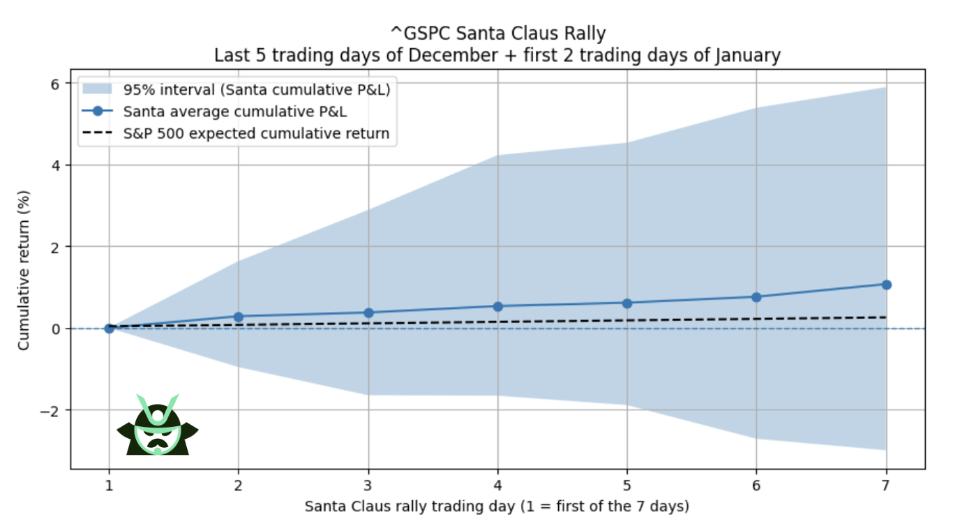 The backtest covers every Santa Claus rally period since 1950, using the last 5 trading days of December and the first 2 trading days of January. When you line up all these 7 day windows, the average return is positive. This supports the idea that the Santa rally effect shows up in real data, even if the strength varies from year to year.