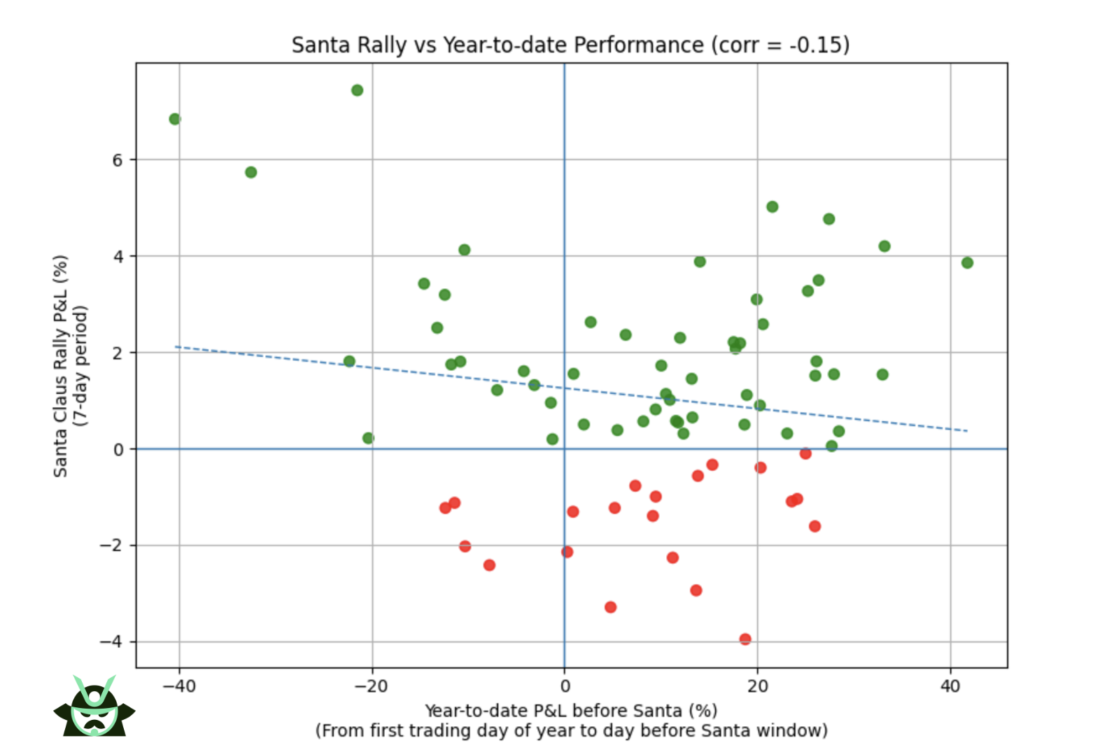 The next question is whether the tone of the year influences what happens during the Santa Claus rally. If a year was strong or weak, do those gains or losses spill into the last 7 trading days of the period? The backtest shows a relationship, but it is weak and not reliable enough to build a trade on. The scatter plot makes this clear: