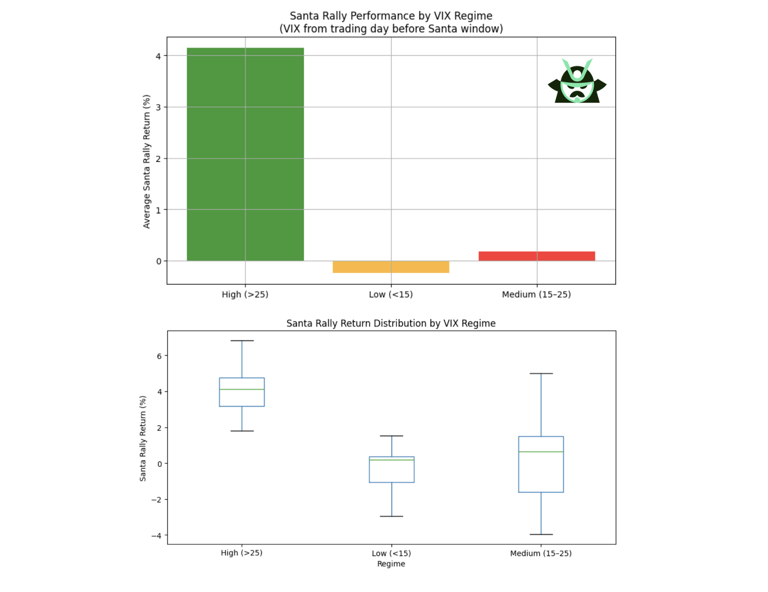 The results above show a clear pattern on the extremes. When the VIX sits above 25, the Santa Claus rally tends to be strong, which fits the idea of mean reversion after stress. When the VIX is below 15, the average return slips slightly negative, suggesting the market may already be priced for calm. The messy part sits between 15 and 25, where outcomes scatter everywhere and no clean structure appears.