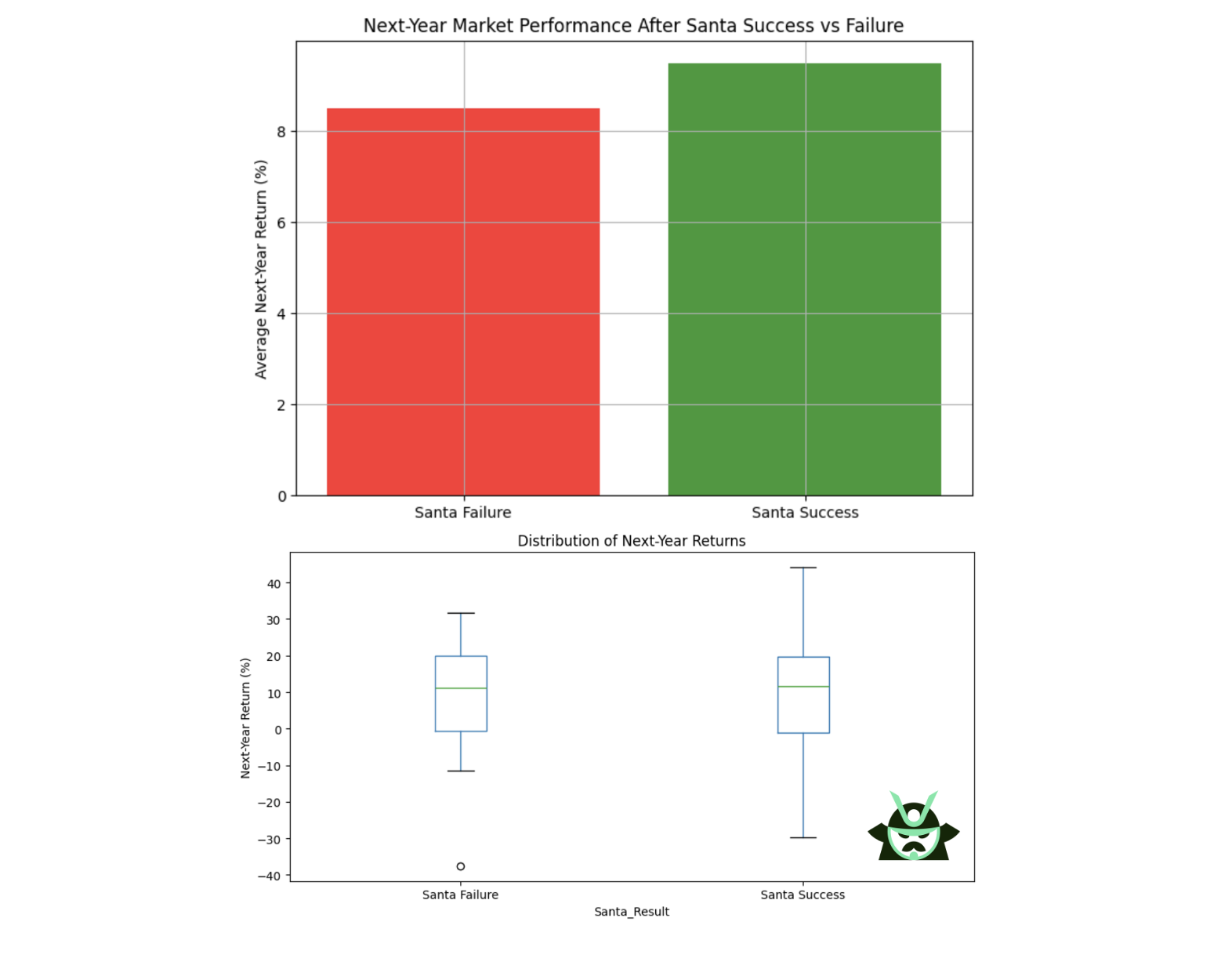 A common claim is that a failed Santa Claus rally signals weakness for the next year. To test this, the backtest split every season into two groups, positive or negative, then compared the full year S&P 500 return that followed each one. The result is simple: there is no meaningful difference between the two groups.