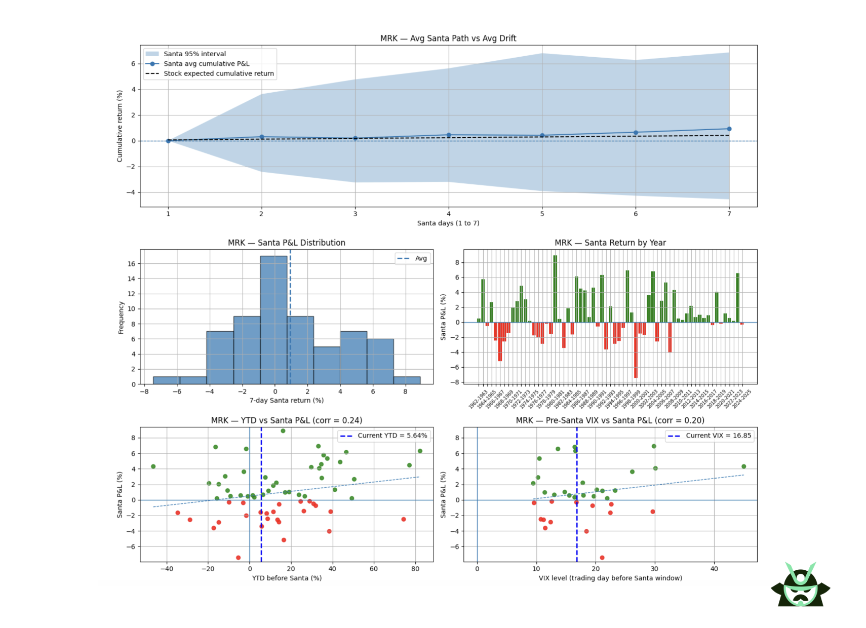 Take MRK as an example. Its results almost flip the S&P 500 pattern. In the index, weak YTD periods often led to strong Santa rallies. In MRK, strong YTD performance generally paired with strong Santa periods, and weak years stayed weak.