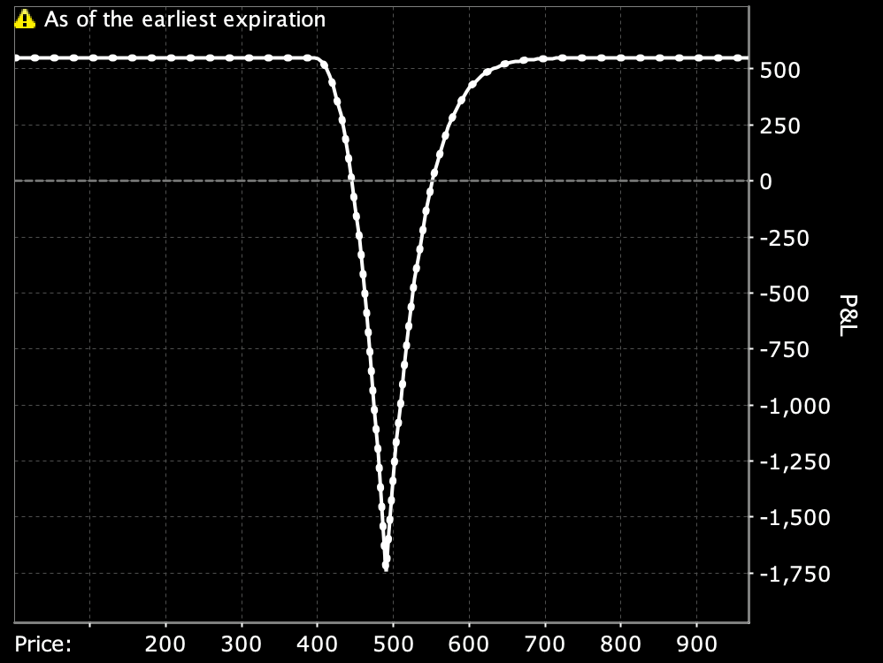 Rather than buying puts outright, you want to take advantage of volatility by using a spread involving puts in the short-term while selling another longer-dated put. So, with ADBE trading at $483.31, you could sell a three-month $490 put and buy a one-month $490 put, obtaining this P&L profile: