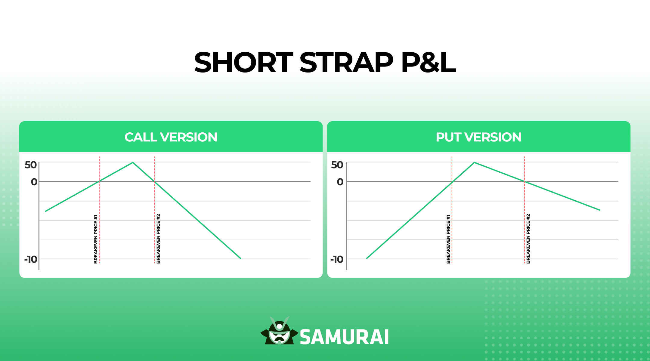 Notice that, while we won’t focus on it, there’s also a short version of this strategy. The short strap option strategy involves selling three options: either 2 calls and 1 put for a bearish tilt, or 2 puts and 1 call for a bullish lean, as you can see from the P&Ls below: