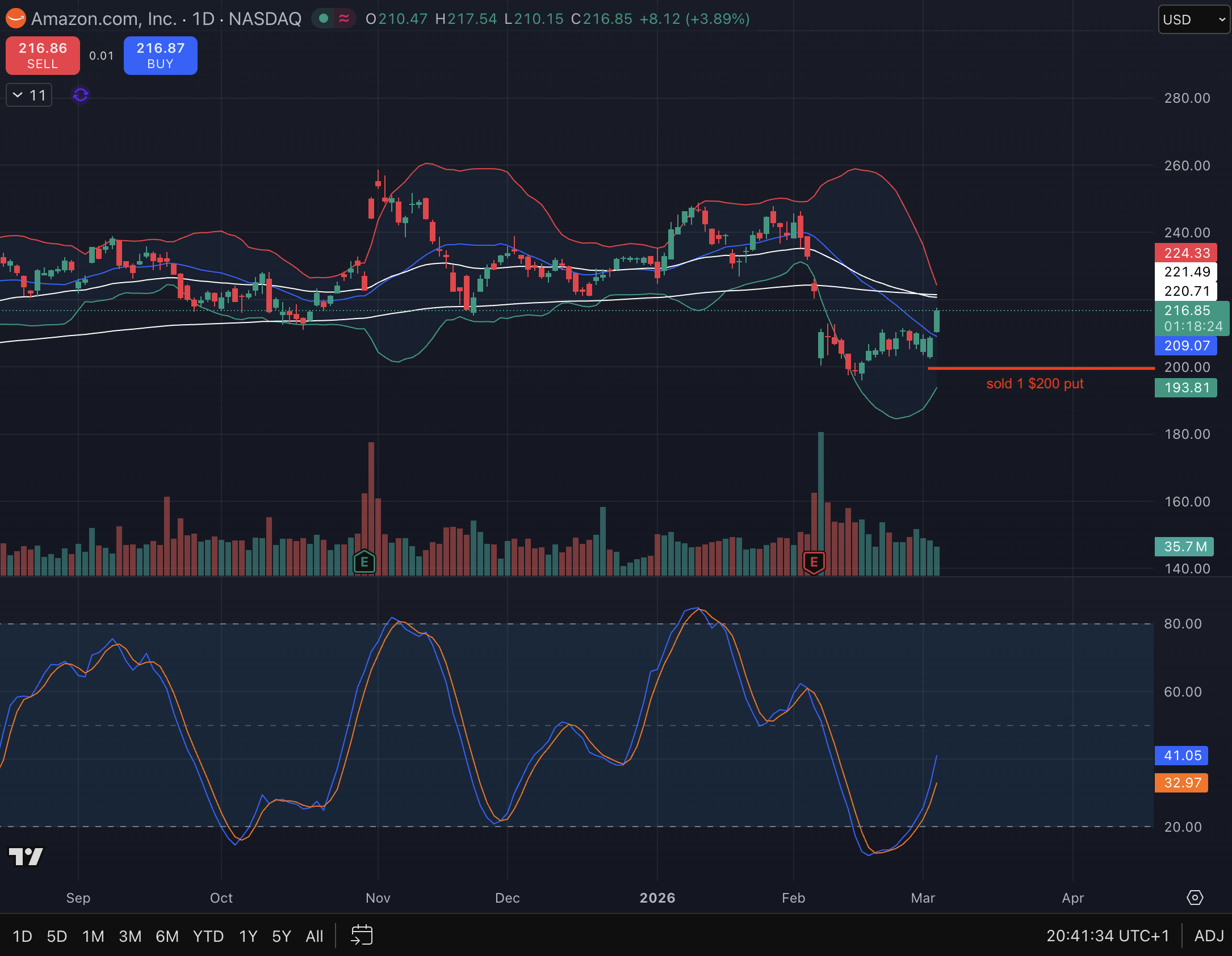 Amazon (AMZN) looks at the beginning of a (potentially) positive cycle, and IV is not low (IV rank above 60%), so I sold a put expiring in a month: