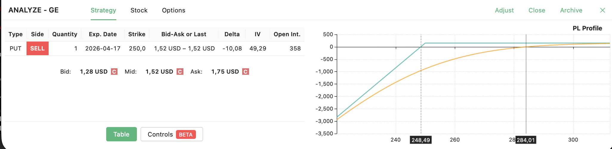Yes, today GE went into dead-cat-bounce mode with a +5% move, but my breakeven price at about $248.49 is quite far from the current price, so I'm comfortable with this setup.