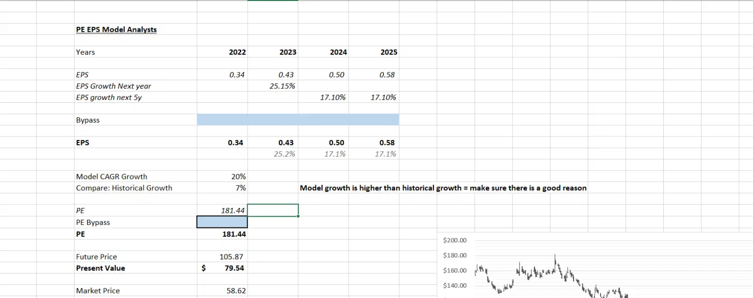 In this case, I will not change the PE ratio as it is reasonable (I believe). So I will focus on changing the EPS and the growth rate. In this step, I will slowly increase/decrease the values to see the magnitude it changes the final result and see if it makes sense.