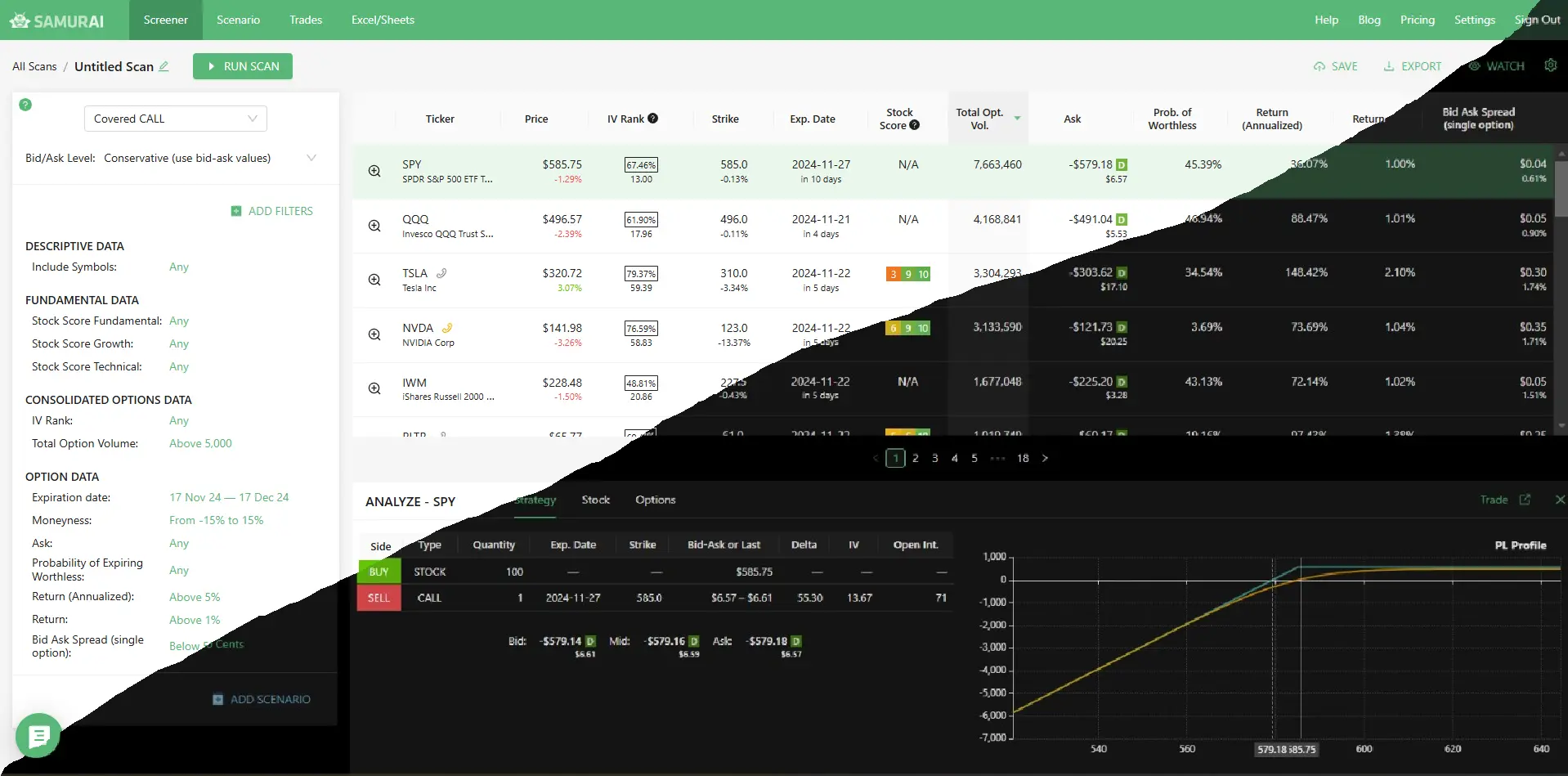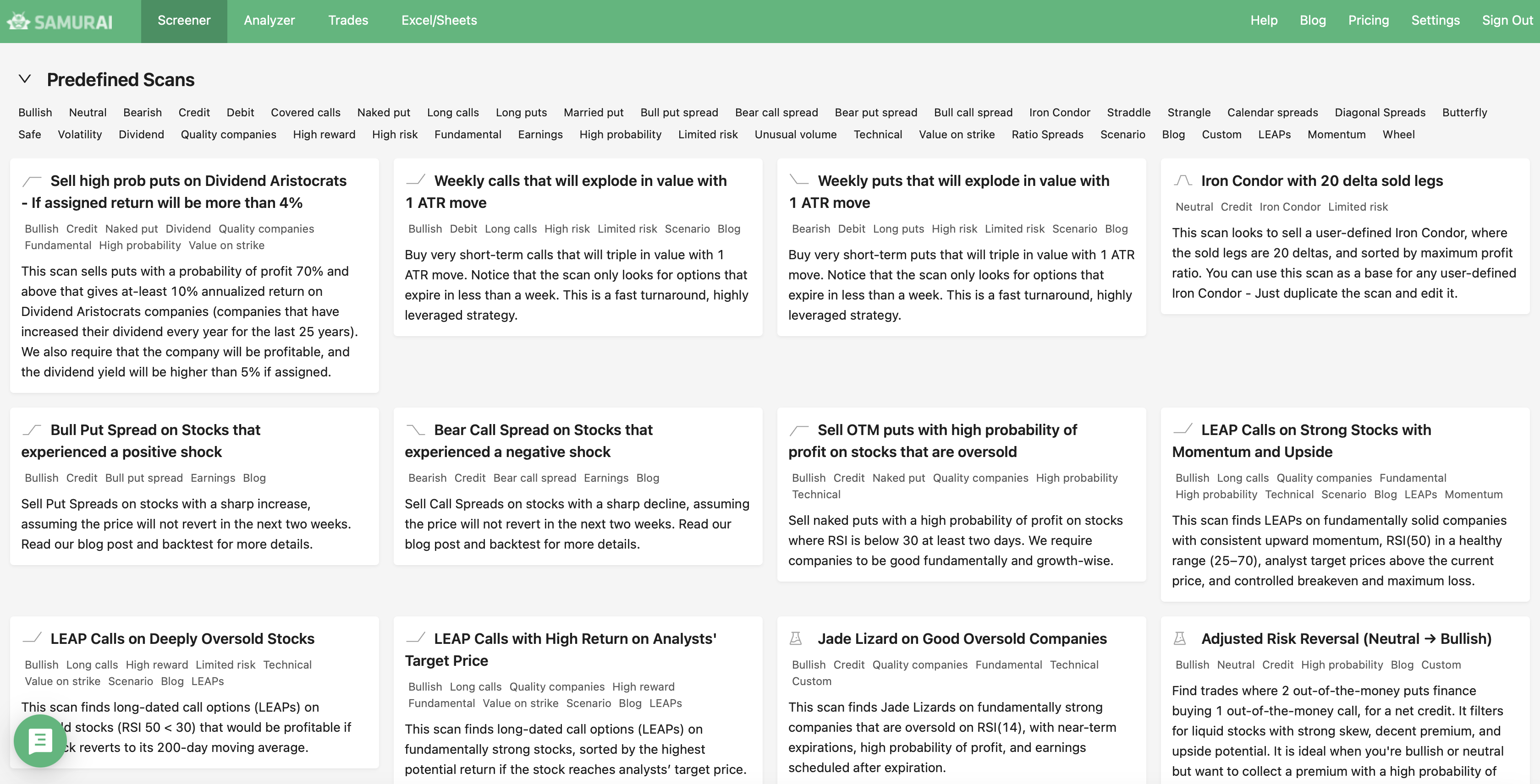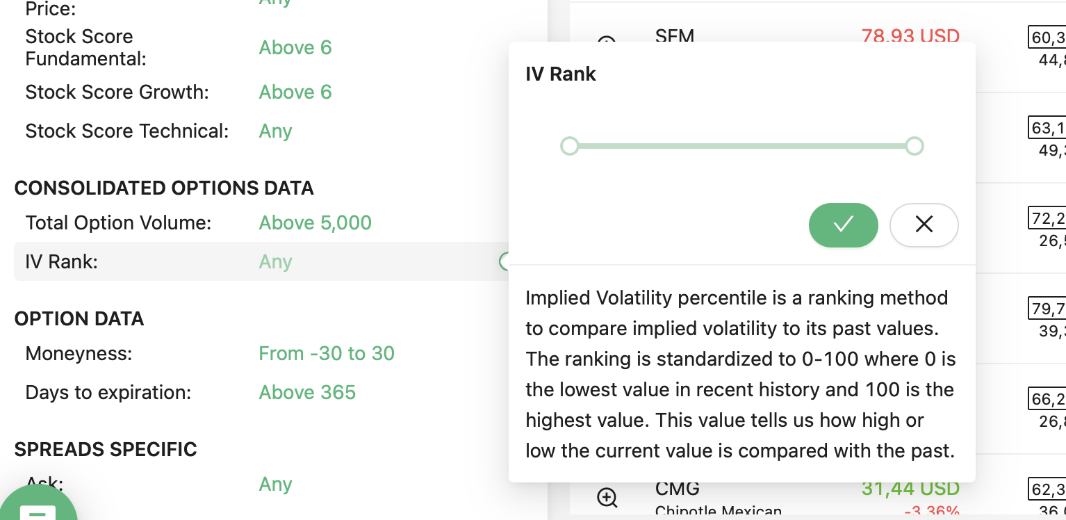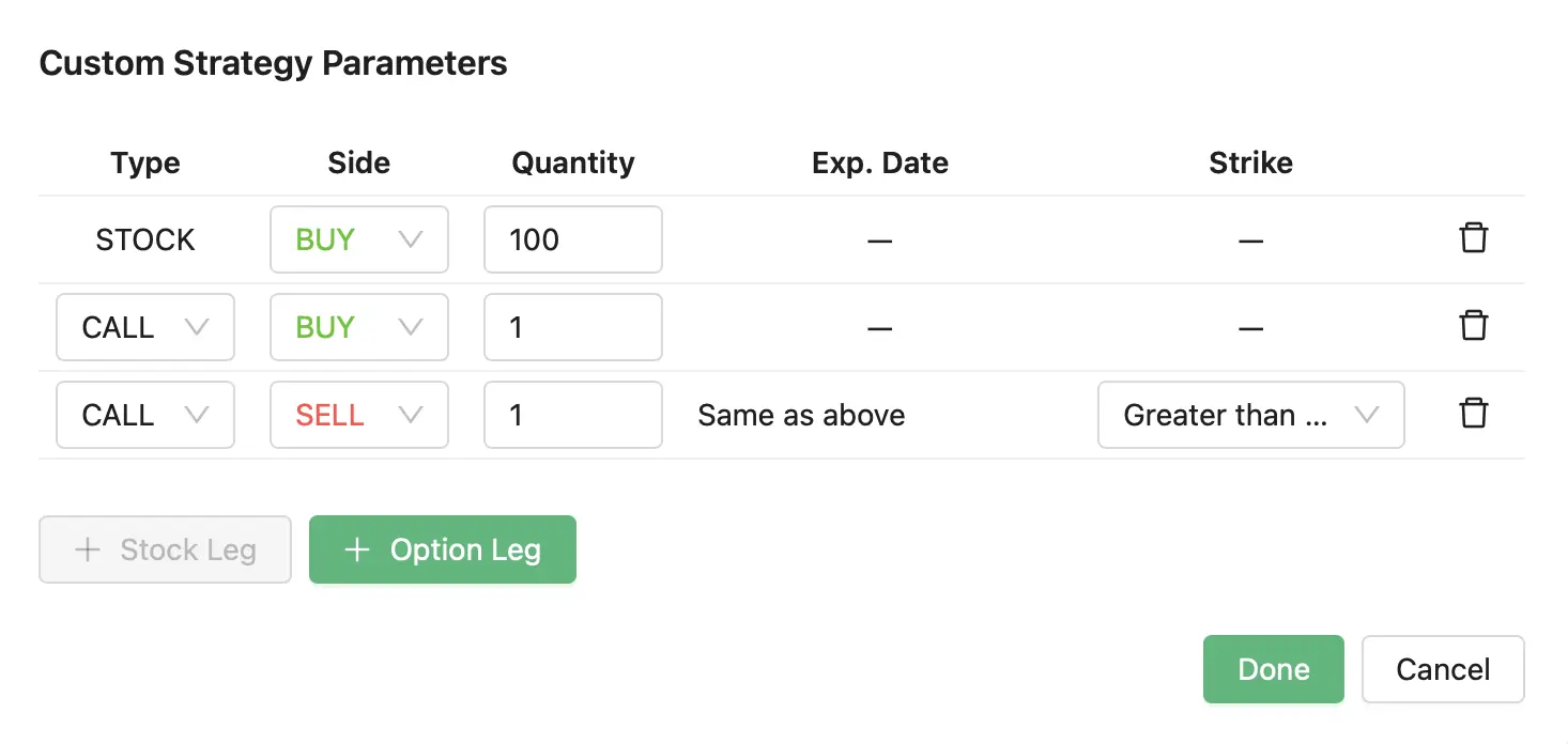 We support 24 strategies and allow you to find the best trades in: Covered call, Naked put (cash-secured put), Long call, Long put, Married call (protective call), Married put (protective put), Bull Call Spread, Bull Put Spread, Bear Call Spread, Bear Put Spread, Straddle, Strangles, Iron Condor, Diagonals, Butterflies and more. Check our knowledgebase for more information.