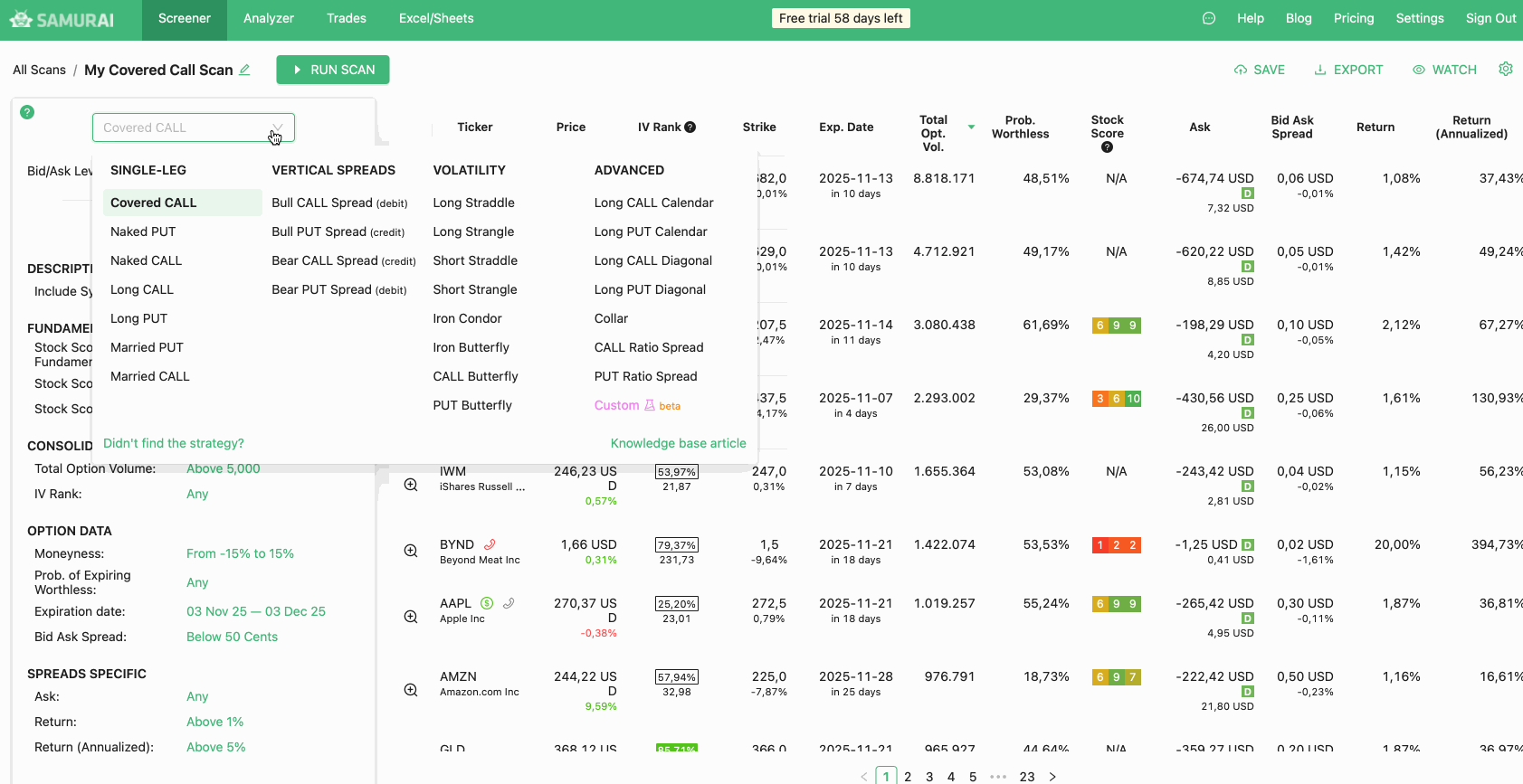Whatever your style (income, directional, or volatility trading) the Samurai Screener has you covered.