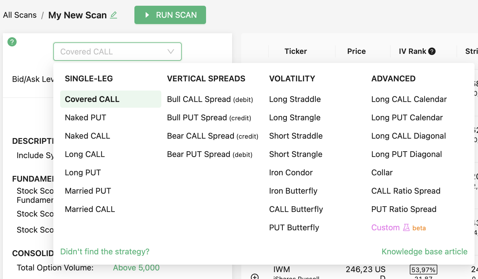 We support 24 strategies and allow you to find the best trades in: Covered call, Naked put (cash-secured put), Long call, Long put, Married call (protective call), Married put (protective put), Bull Call Spread, Bull Put Spread, Bear Call Spread, Bear Put Spread, Straddle, Strangles, Iron Condor, Diagonals, Butterflies and more. Check our knowledgebase for more information.