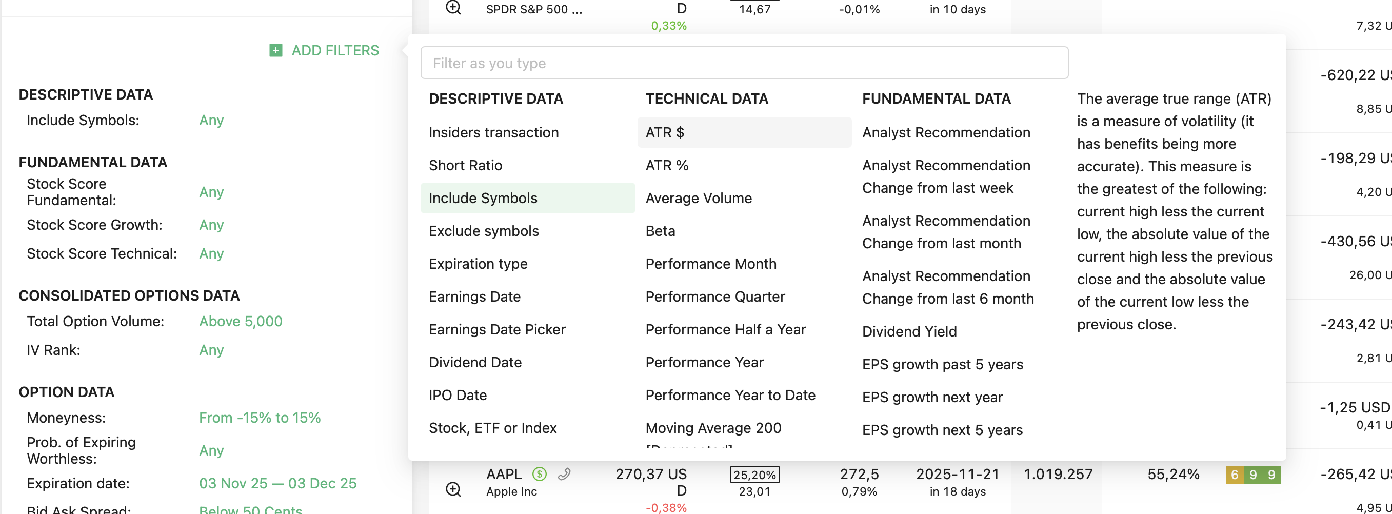 Refine results using 100+ filters, including volatility rank, probability of profit, expected move, and liquidity indicators.