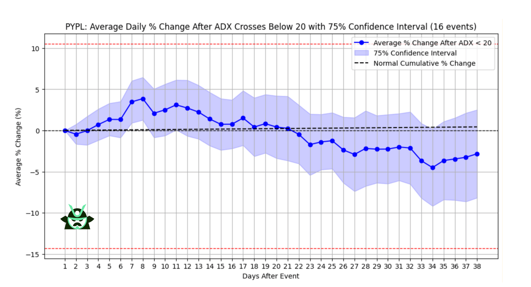 Note that we have added the average price change (in blue) with its 75% confidence interval (the blue area). We have also added the two breakeven thresholds (the red horizontal lines) and the average price change of the stock on a normal day, ignoring its ADX indicator (the black line).