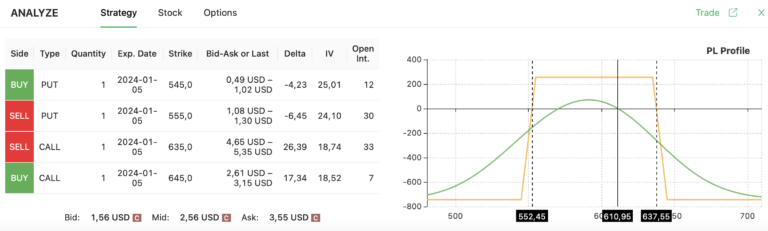 Let’s again consider COST. You want to open a position to potentially profit from its earnings announcement, and you decide to go for an iron condor, having heard it’s safer than a short strangle. The potential for unlimited loss in simpler strategies is too risky for your liking. By using the options screener feature mentioned earlier, you find that you could buy a $545 put, sell a $555 put, sell a $635 call, and buy a $645 call.