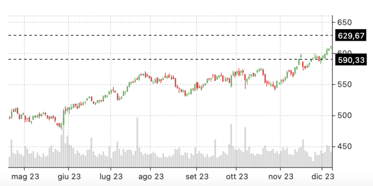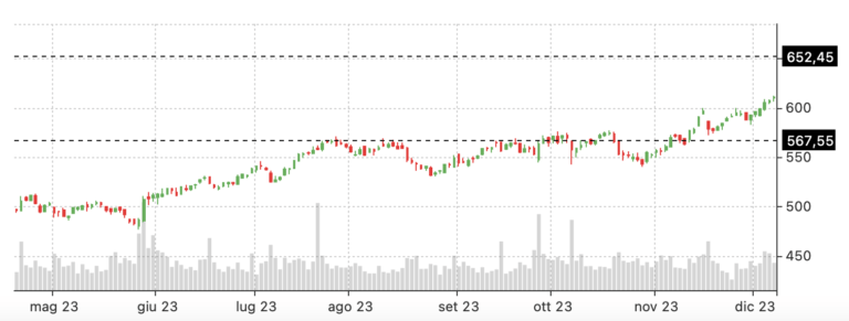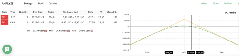 Essentially, we’re saying the stock price at expiration needs to fall between $567.55 and $652.45 (refer to the price chart below to have a better view of what you need to happen to have a profit). If you view this scenario as extremely likely, this could be a solid trade idea. Another small benefit of this strategy is that it is a relatively easy strategy to manage (roll, close one side, etc.) as there are only 2 sold options, and in most assets, the liquidity will allow you to manage the position with relatively small friction.