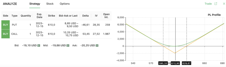 Let’s take a real-world example to illustrate the earnings option strategy using a long straddle. Imagine you’re examining Costco Wholesale (COST), which is currently trading at $610.95. You’re interested in profiting from its upcoming earnings announcement and have decided to implement a long straddle.