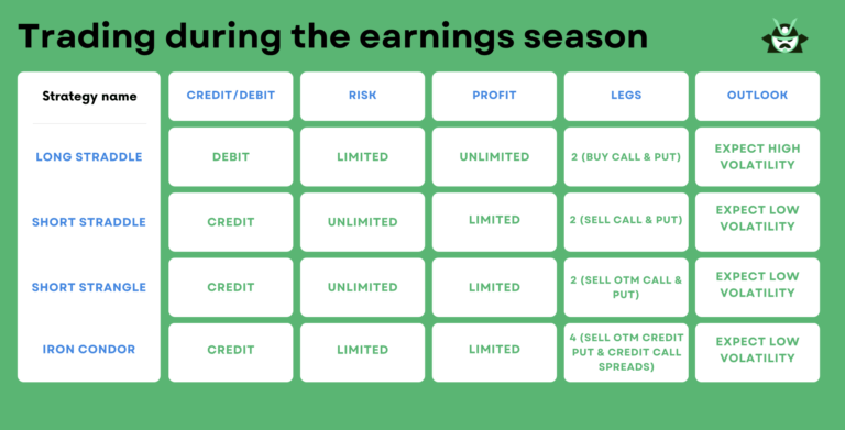 To reiterate, the choice of earnings options strategy depends heavily on your market expectations. The following table summarizes the strategies we’re going to study in this article: