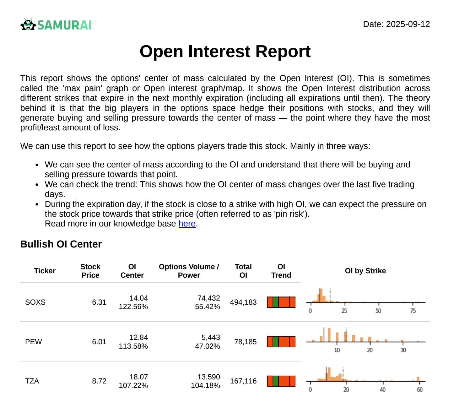 This is the simplest way to use the open interest report. Every day, we take the Top 3 bullish and Bottom 3 bearish tickers based on how far the stock price is from the OI Center. The setup is mechanical: