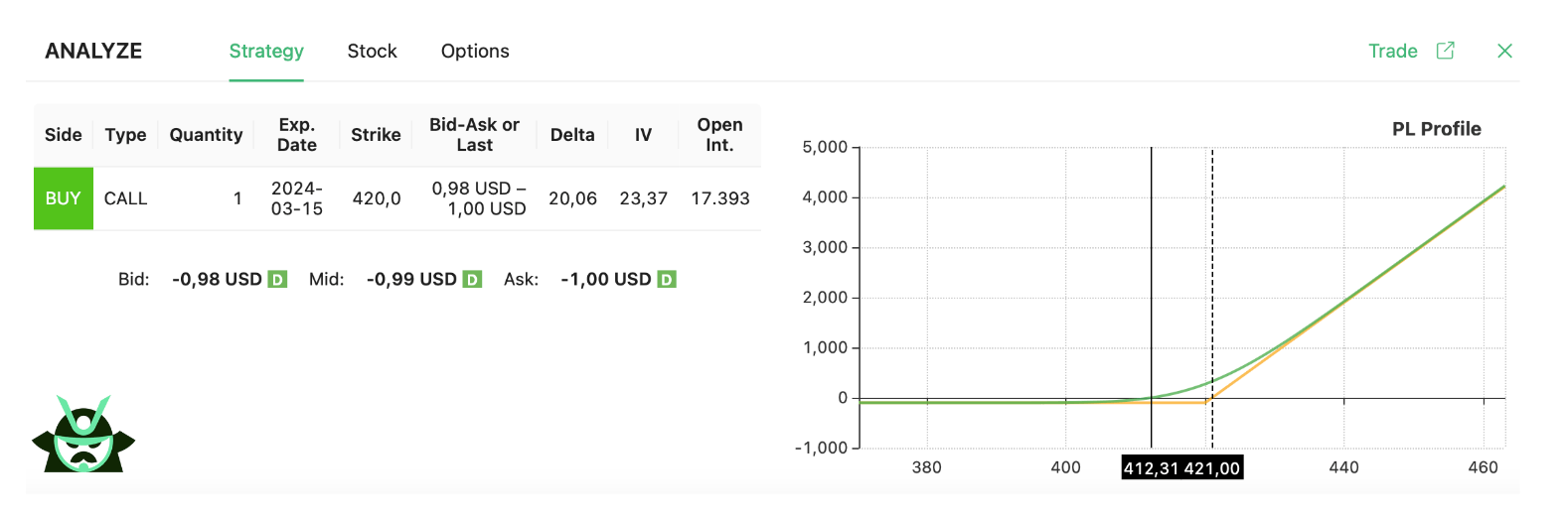 This option, with bid-ask values around $1 (as you can see above), has no intrinsic value and only extrinsic value, also known as time value. As the expiration date is close, even this extrinsic value is low. For this option to become profitable, MSFT would need to close above $421 by the expiration date.