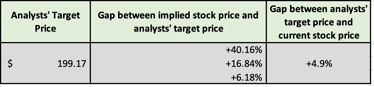 In the same table, on the right-hand side, we’ve also included analyst target prices. This is another benchmark to gauge the accuracy of your implied growth rate. In the gray cells of the table, you’ll find the following details: